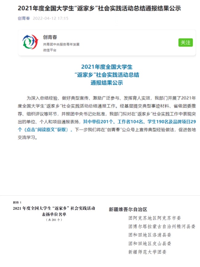 4月12日,共青团中央服务青年发展微信平台“创青春”发布了《2021年度全国大学生“返家乡”社会实践活动总结通报结果公示》,我校获得2021年度全国大学生“返家乡”社会实践活动表扬单位,是全疆唯一获得此项荣誉的高校。