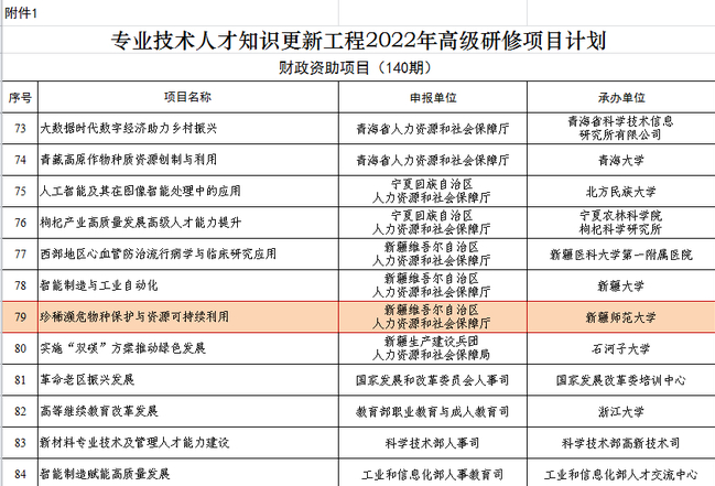 根据自治区人力资源和社会保障厅《关于征集专业技术人才知识更新工程2022年高级研修项目的通知》要求,我校国家级专业技术人员继续教育基地积极组织各学院专家参与申报。经自治区人社厅评审推荐,国家人社部终审评定,我校生命科学学院申报的《珍稀濒危物种保护与资源可持续利用》成功入选该项目计划,并获得国家财政资助。