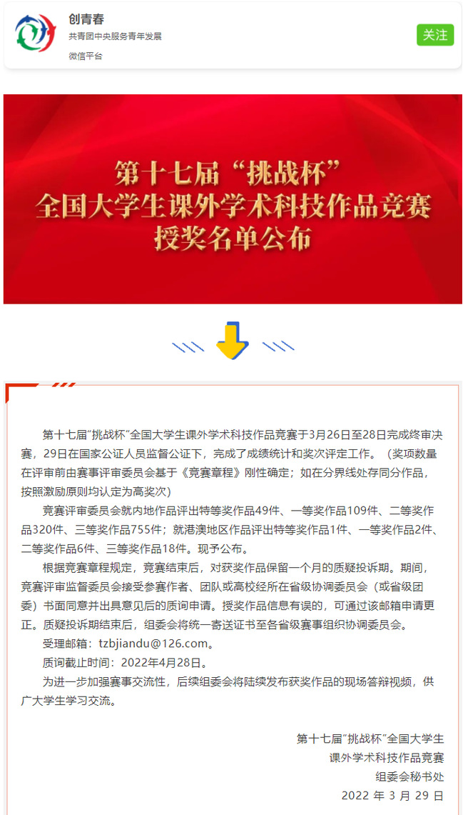 我校自启动第十七届“挑战杯”赛事工作以来,校团委广泛动员师生积极参赛,经校级评审、公示,共推荐6件作品参加自治区赛,并获得二等奖2项、三等奖3项,学校获自治区第十七届“挑战杯”优秀组织单位。经自治区赛推荐,最终我校4件作品入围全国赛。