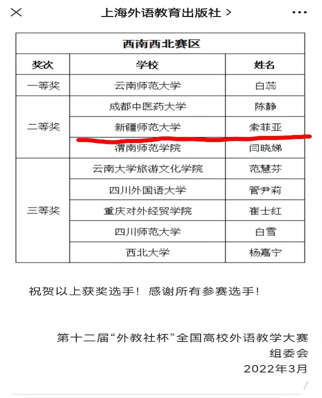 3月10日,第十二届“外教社杯”全国高校外语教学大赛日语专业组分赛区获奖名单公布,我校外国语学院教师索菲娅·范的参赛作品经评审获得西南西北赛区二等奖。