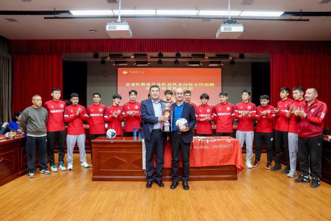 教练员及队员代表向校史馆捐赠比赛奖杯、签名队旗