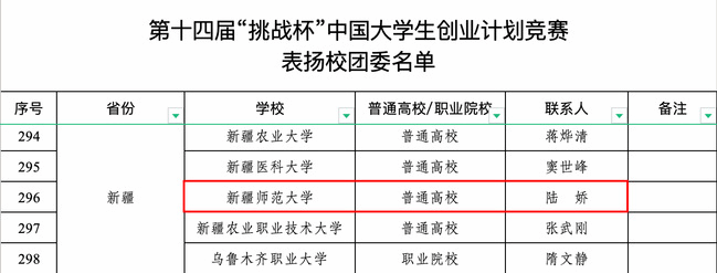 近日,共青团中央青年发展部对在第十四届“挑战杯”中国大学生创业计划竞赛组织发动工作中表现突出的省份团委和高校团委致信表扬。全国共有2700余所高校组织参加“挑战杯”竞赛,其中新疆5所高校团委位列表扬名单。