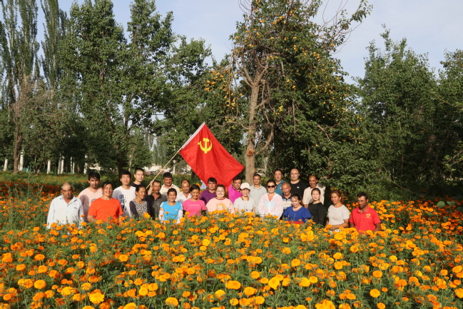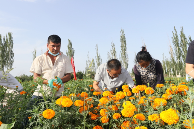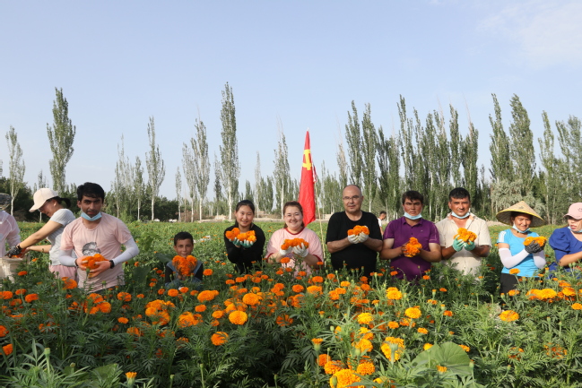 该村村民古荪·扎依提家中缺少劳动力,在今年被识别为脱贫不稳定户。近日,她又因心脏病发作住院,导致种植的1亩万寿菊无法采摘。7月2日下午,村党总支组织全体党员抢收她家的万寿菊,学校“民族团结一家亲”结亲干部和参加暑期实践的师大学生一同劳动,很快就完成了万寿菊采摘工作。“我们结亲过来,能和村民多沟通交流,帮助干一些力所能及的活儿,感觉挺好。”结亲干部赵成喜说。“能在建党100周年的时候,和全村党员一起帮助困难村民采摘万寿菊,这一次的意义有点不一样。”工作队队员赛迪古丽·哈西木笑着说。