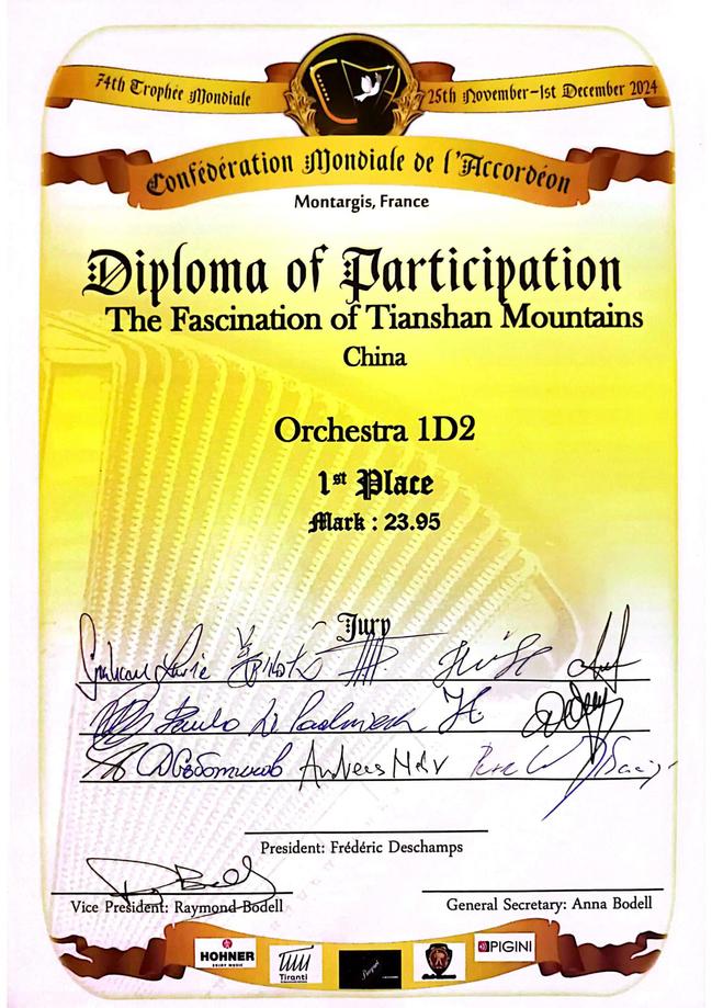 此次比赛于当地时间11月25日至11月30日在法国蒙塔吉斯市举行,经过世界各地的分赛选拔,来自三十多个国家的300多组优秀手风琴团队、近500名选手参与比赛。我校音乐学院“天山神韵”手风琴乐团成员由陈怡教授带队,王颖、李莉、任洪胜三位教师及本科生、硕士研究生共11人组成,凭借《冰山上的来客》(作曲:谢飞)《永恒的石榴花》(作曲:谢飞)《我开火车游祖国》(作曲:许笑男)三首作品的的精湛表演和团队协作,在众多参赛团队中脱颖而出,最终获得了乐团1D2组的冠军;乐团成员、2022级硕士研究生黎泯瑾获得国际公开大奖赛组(IOT)10组亚军,展现了乐团整体实力和成员个人风采。