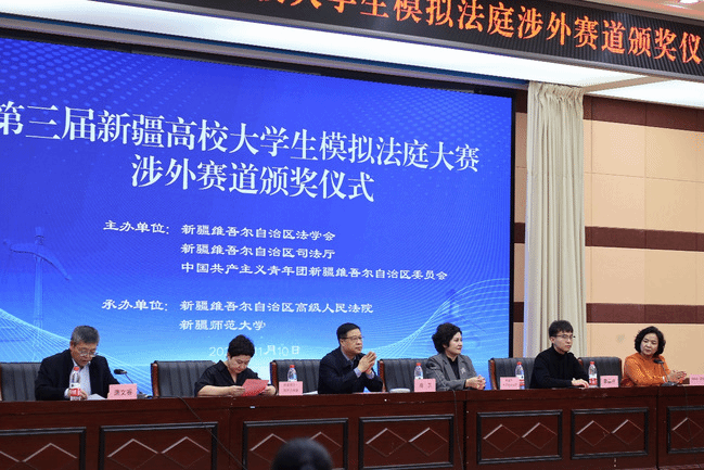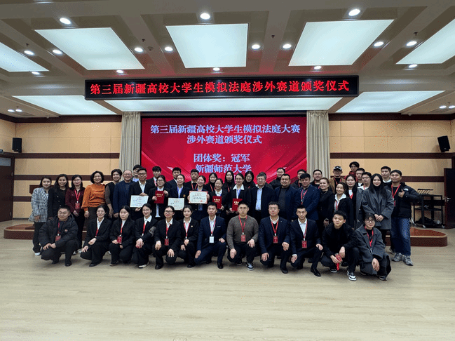 为进一步提升新疆地区法学专业学生的国际视野与实践能力,积极响应国家关于加强涉外法治人才培养的号召,11月10日,“第三届新疆高校大学生模拟法庭大赛涉外赛道”在自治区高级人民法院首次举办,我校代表队取得冠军的优异成绩。