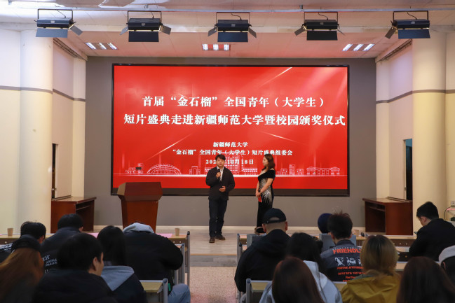 10月18日,首届“金石榴”全国青年(大学生)短片盛典走进新疆师范大学暨校园颁奖仪式在昆仑校区艺术楼学术厅举办。校党委副书记刘俊、中国传媒大学视听艺术研究中心主任赵晖、中国高等院校影视学会秘书长许波、对外经贸大学国际数字商贸及文化研究院院长许斌、对外经贸大学院长助理金潇潇,“金石榴”全国青年(大学生)短片获奖作品代表以及美术学院师生代表参加仪式。