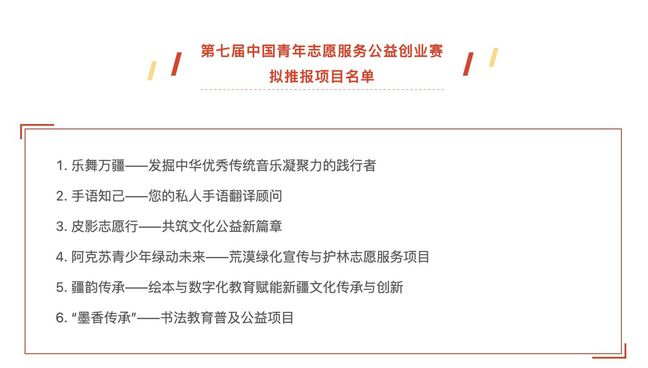 决赛形式包括线下路演和现场答辩。各参赛项目派出代表,展示阐述志愿服务项目的目标、成效、社会影响等。最终我校选送的《手语知己——您的私人手语翻译顾问》《皮影志愿行——共筑文化公益新篇章》获金奖,《“践行文化润疆服务乡村振兴”新疆师范大学“同一片蓝天下”教育实践》等12个项目获铜奖。《手语知己——您的私人手语翻译顾问》《皮影志愿行——共筑文化公益新篇章》《疆韵传承——绘本与数字化教育赋能新疆文化传承与创新》《“墨香传承”——书法教育普及公益项目》4个项目推荐至国赛。
