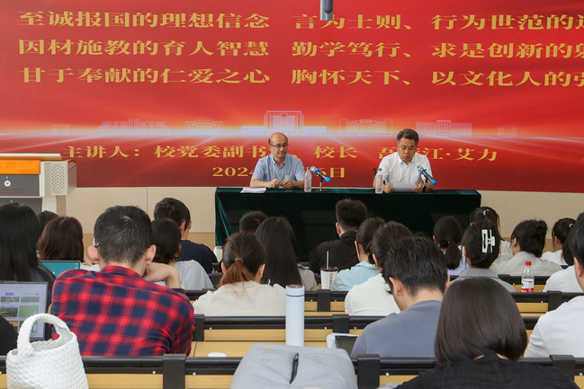 在中华人民共和国成立75周年和第40个教师节到来之际,为深入贯彻习近平新时代中国特色社会主义思想、党的二十大和二十届二中、三中全会精神,学习贯彻习近平总书记关于教育的重要论述精神,认真落实《中共中央国务院关于弘扬教育家精神加强新时代高素质专业化教师队伍建设的意见》,激励广大教师潜心育人,争当“四有”好老师,切实提高新入职教师育人水平,9月6日下午,校党委副书记、校长吾满江·艾力为2024年新入职专任教师讲授“践行教育家精神 担当新时代使命”入职教育第一课。全校67名2024年新入职专任教师及受援建院校12名跟岗学习教师参加活动。活动由校党委常委、副校长王世杰主持。