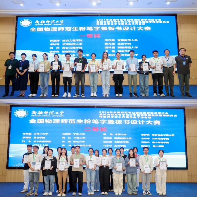 会议期间,还举行了首届全国物理师范生粉笔字暨板书设计大赛,共有来自20所高校共计29名学生参加比赛,评选出一等奖11名、二等奖18名,同时举行了由各师范院校相关专业院长、系主任和中学校长参加的圆桌论坛,乌鲁木齐市八一中学党委副书记丁占军作了“基础教育‘启智润德’育仁模式建构研究 ”的主题发言,与会专家围绕中学教师培养需求和师范教育面临的挑战开展了交流。召开了教育部高等学校大学物理课程教学指导委员会师范类专业工作委员会工作会议,对下一步工作进行了部署安排。