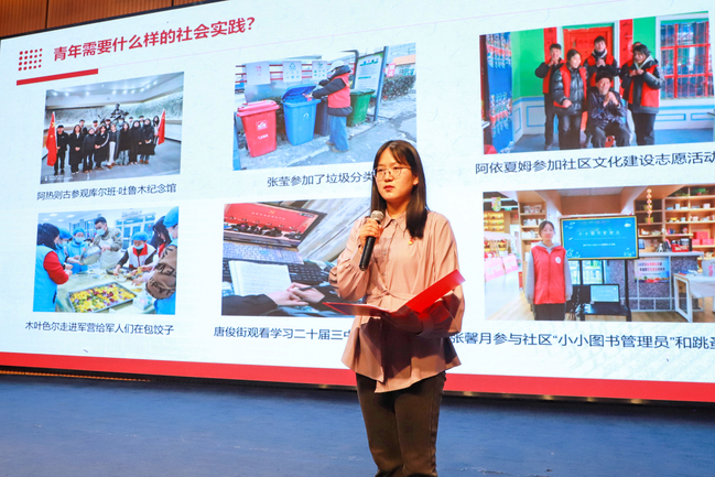 汇报分享环节中,教育科学学院团委书记杨冰、“大国边疆,青春助力”实践团成员付艺强、“红石榴”宣讲员暑期社会实践团成员麦日排提·库热西、商博会及世界媒体峰会志愿者朱明阳、西部计划(研究生支教团)成员马杨洋分别从经验总结到理论建构、全局视角到参与者的微观体验、个体成长、情感共鸣四个方面作了分享。