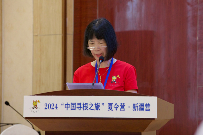 参营单位教师代表、荷兰领队徐谊梅分享了自己多年来带领华裔青少年参加“中国寻根之旅”夏令营的经历和感受,对新疆营的举办表示了高度的赞扬和期待,鼓励营员们珍惜这次难得的机会,深入了解中华文化,感受温暖和关怀。