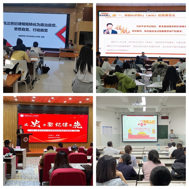 以学铸魂,守初心。为持续推进党纪学习教育走深走实,提升师生党员干部的纪律意识、规矩意识和底线思维,学校党委党校分别组织科级干部培训班、支部书记培训班、处级干部培训班,承办新提拔科级干部培训班,专题开展《中国共产党纪律处分条例》讲座,各二级党委(党总支)书记、党支部书记集中开展党纪学习教育专题党课,教育引导广大师生党员干部深入学习贯彻习近平新时代中国特色社会主义思想,进一步强化对党纪党规的认识,做到知敬畏、存戒惧、守底线。