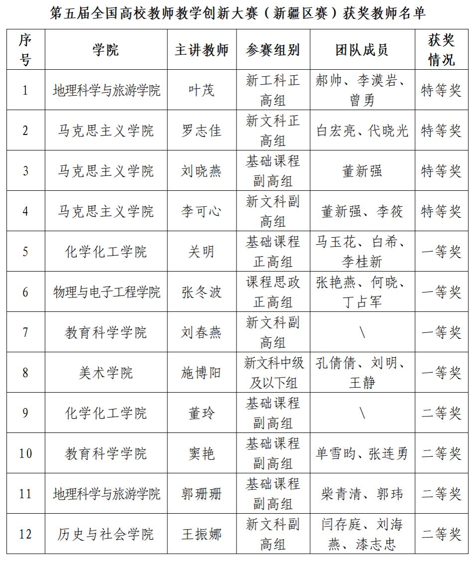 5月17日至18日,由自治区教育厅主办的第五届全国高校教师教学创新大赛新疆区赛决赛在伊犁师范大学圆满收官。我校教师团队凭借精湛的教学技艺、前瞻性的教育理念和扎实的育人成效,在参与决赛的17所高校129名教师(团队)中斩获佳绩,获得特等奖4项、一等奖4项、二等奖4项,学校获颁优秀组织奖,取得了我校在本项赛事中的历史最好成绩。