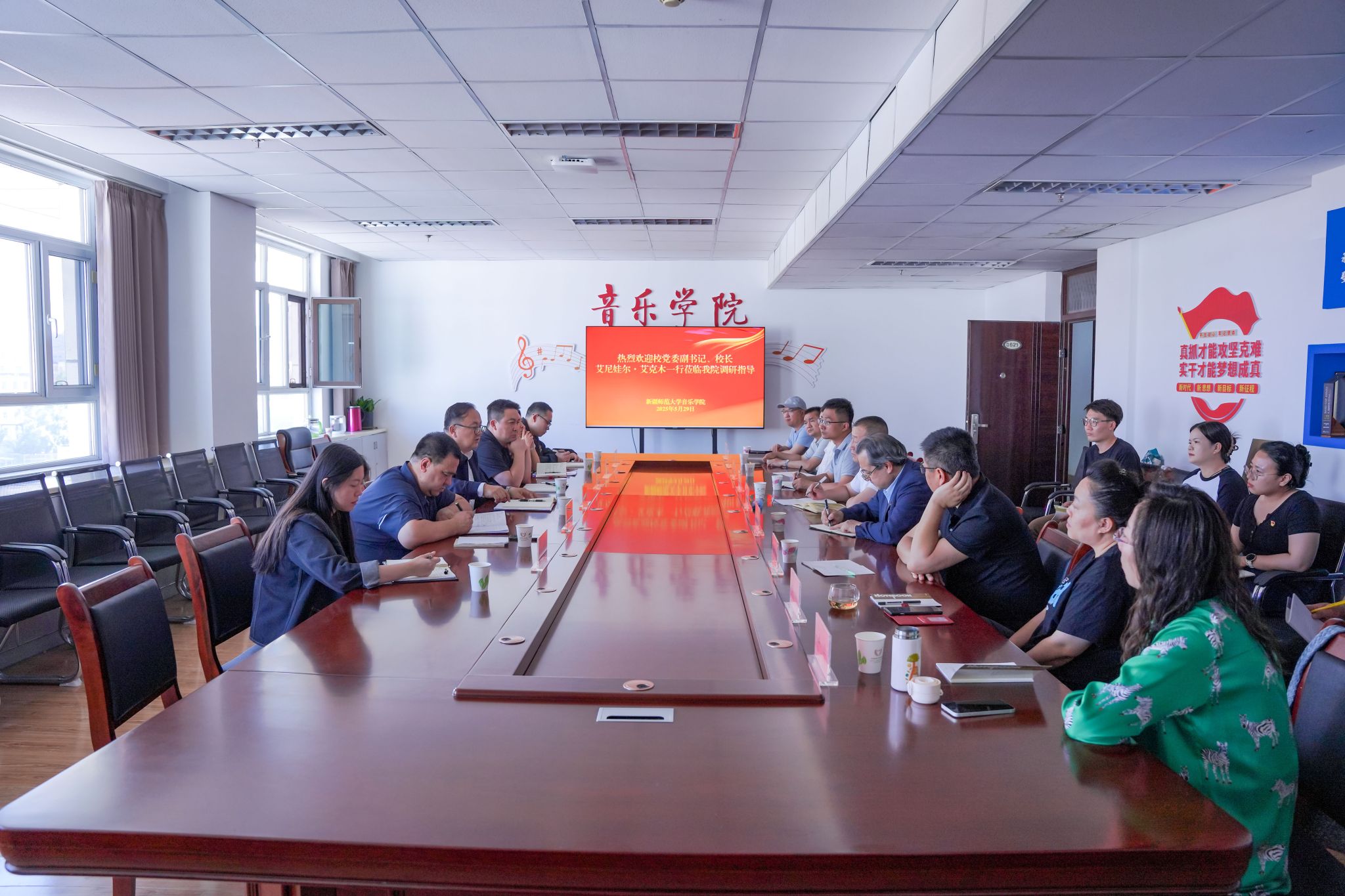 5月29日下午,艾尼娃尔・艾克木来到音乐学院,详细了解学院办学空间环境和条件,并与学院领导班子、教师代表开展交流座谈。音乐学院党委书记杨志刚主持座谈会。会上,音乐学院领导班子及教师代表汇报了学院近期取得的成果及今后的工作计划和目标,同时分析了学院在发展中存在的问题。
