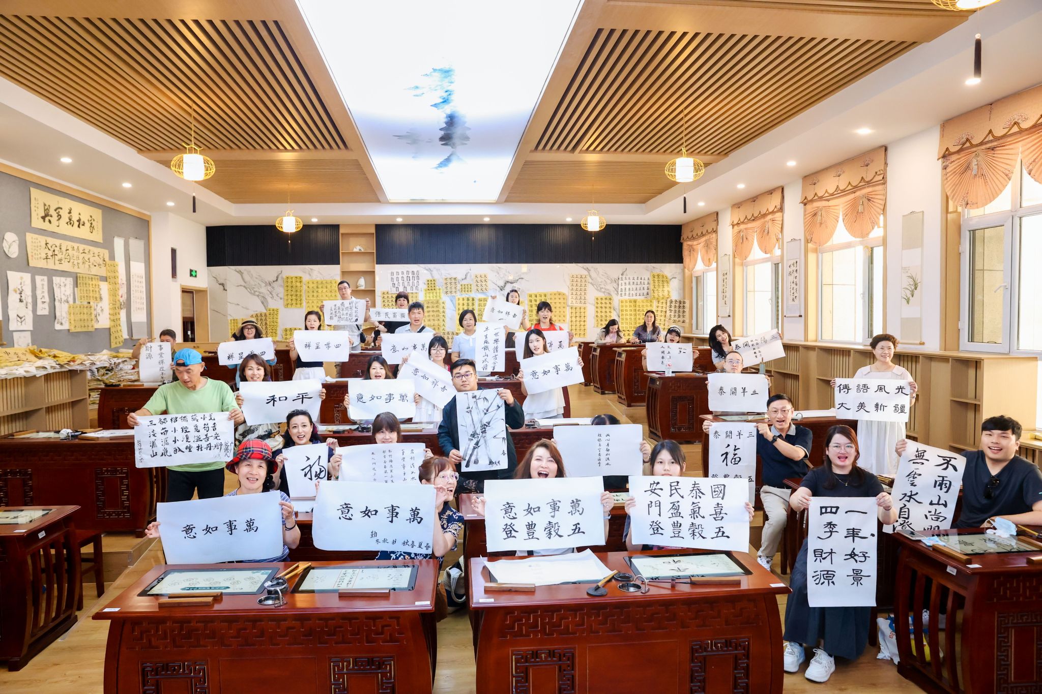 在铸牢中华民族共同体意识教育实践基地,台湾交流团成员积极参与丰富多彩的文化体验活动。在书法课堂中,交流团成员们认真书写“万事如意”“国泰民安”等汉字,体会中华文化的博大精深与深厚底蕴;在茶艺教室内,大家共同学习传统茶艺冲泡技法,感悟中华传统文化的丰富内涵;脸谱绘制环节,成员们用颜料勾勒出传统戏曲人物形象,加深对中华美学的理解与感悟。一位交流团成员在体验画脸谱后感慨道:“这是我第一次体验画脸谱,感觉既新奇又亲切。这些传统文化课程让我们深刻感受到两岸同胞同根同源、血脉相连。”