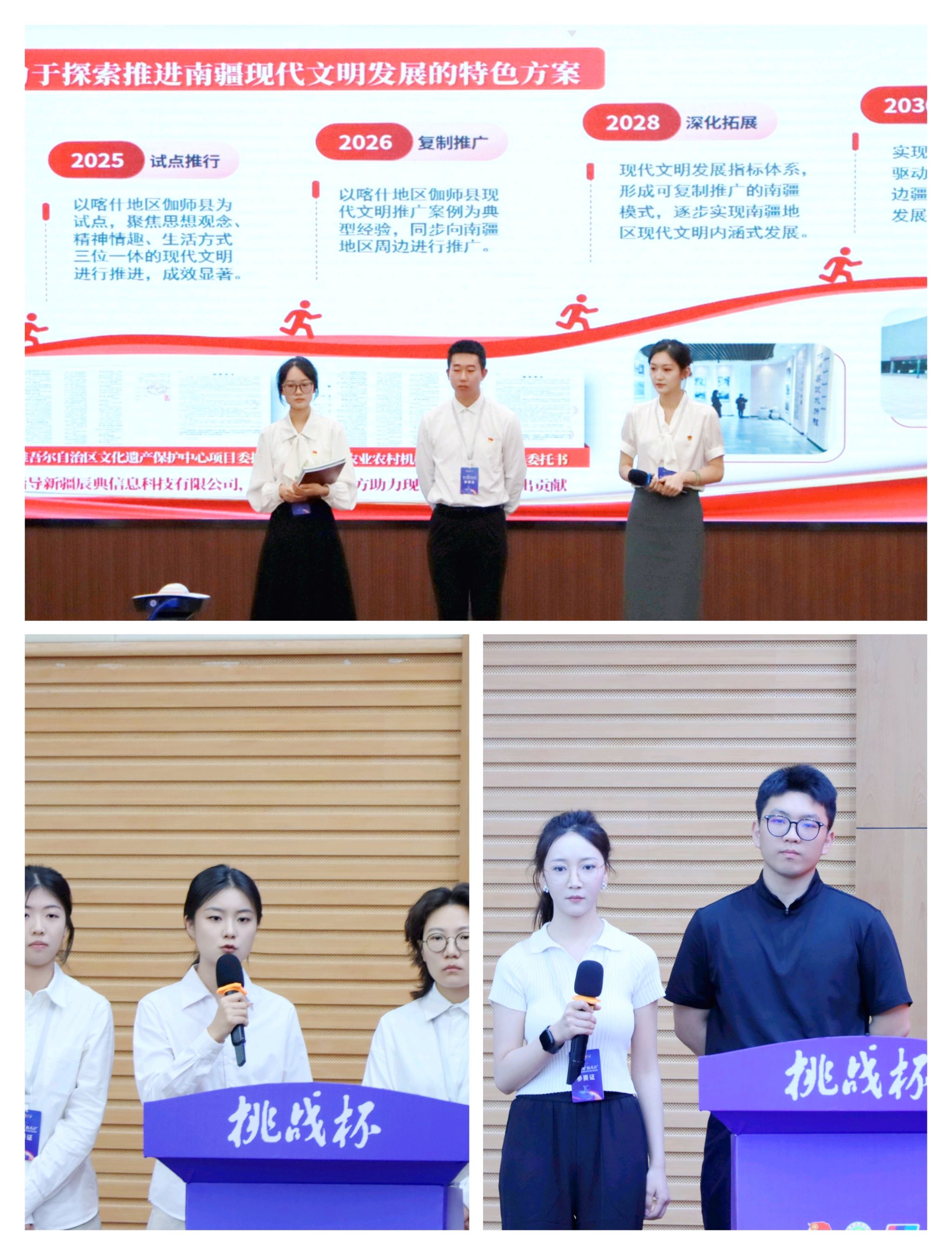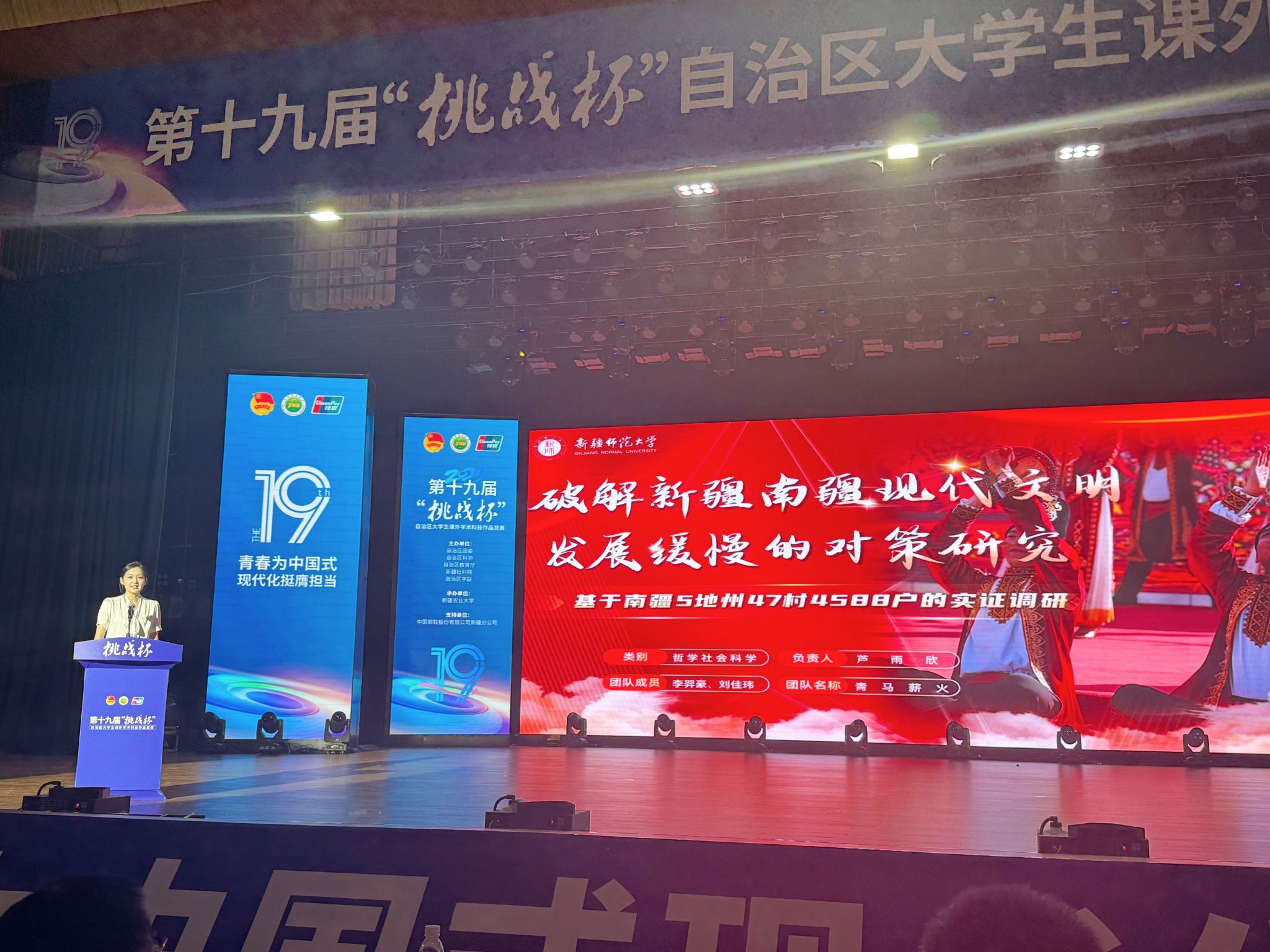 闭幕式上,我校特等奖作品《破解新疆南疆现代文明发展缓慢的对策研究——基于南疆5地州47村4588户的实证调研》作为特等奖获奖作品代表进行了现场交流展示。团队成员以生动的语言、详实的数据和精彩的案例,向与会人员介绍了作品的创作背景、研究过程和主要成果,赢得了现场观众的阵阵掌声。此次展示不仅展示了我校学子的风采,也为其他高校师生提供了学习和交流的机会。