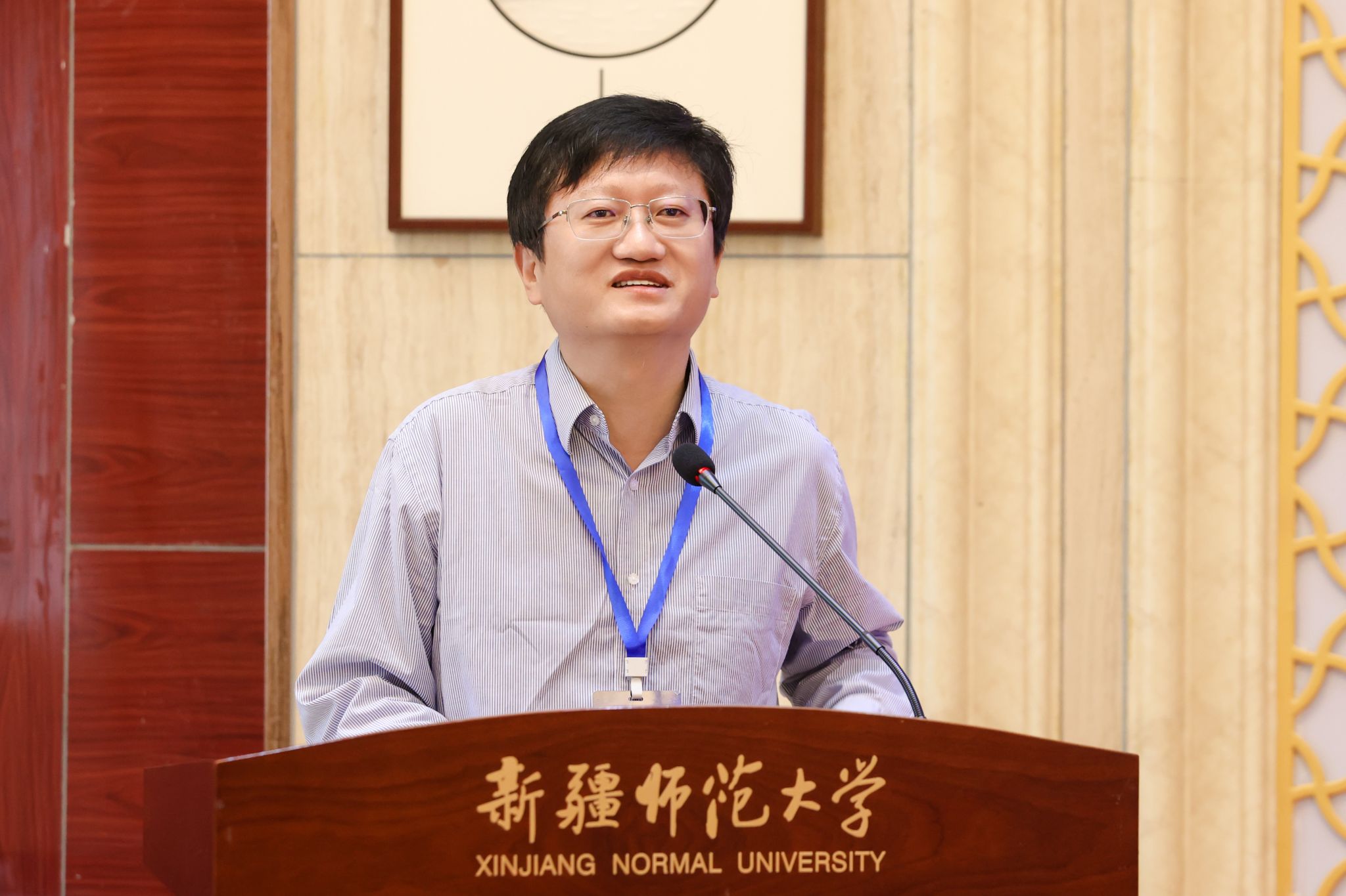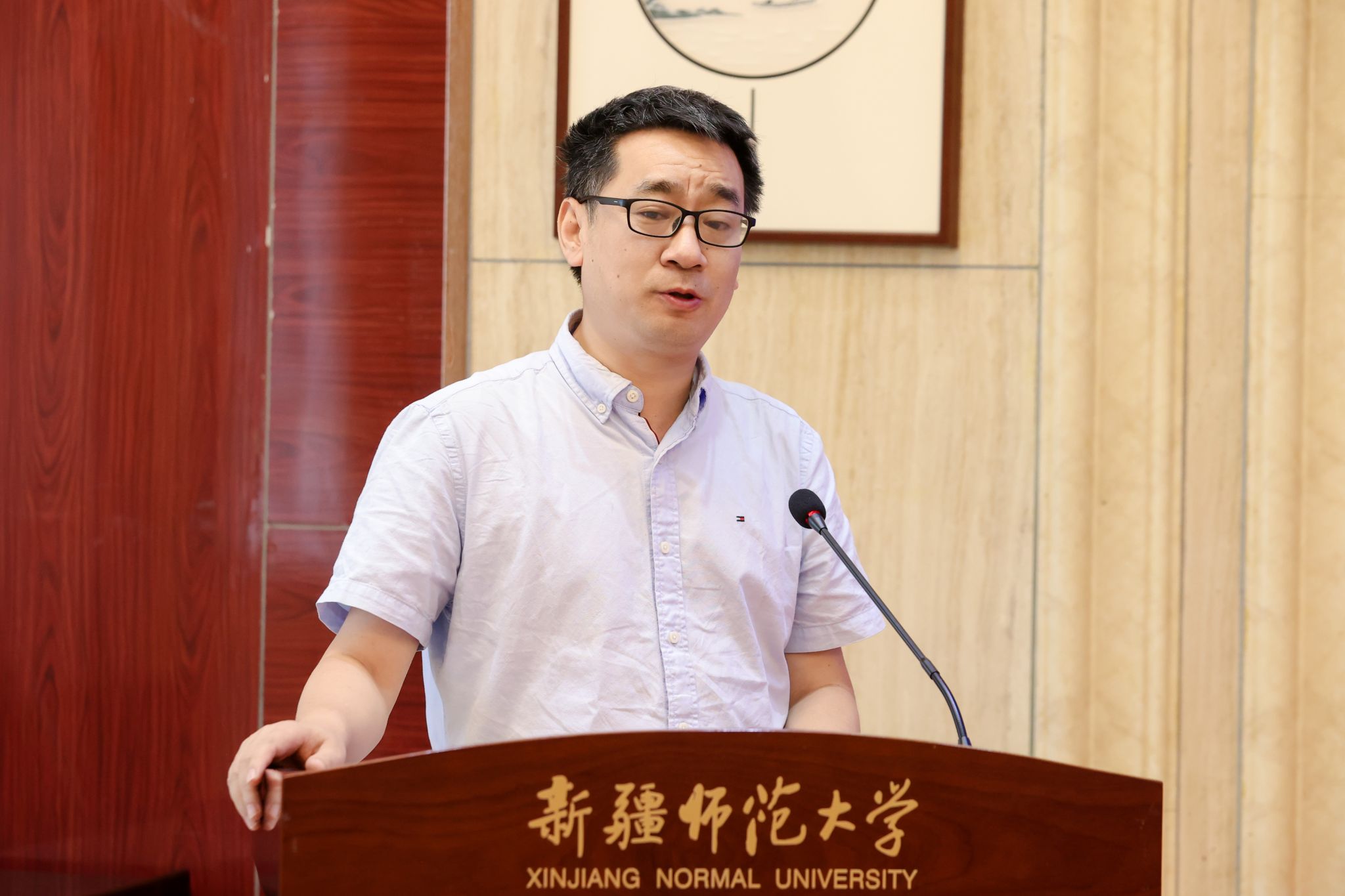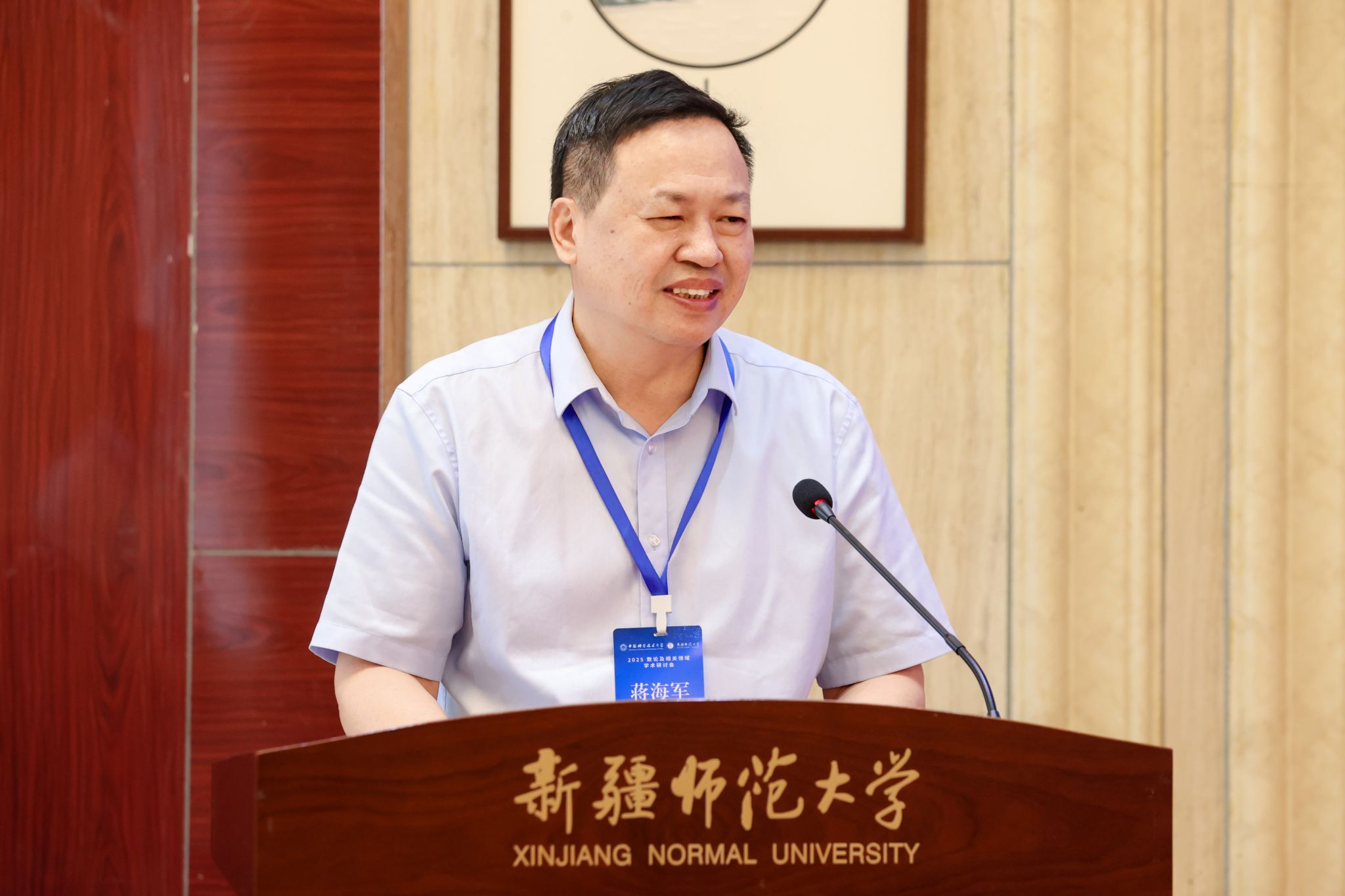 蒋海军代表学校致辞,对远道而来的专家学者们表示热烈欢迎,希望与会的各位专家学者能够对我校的发展,特别是在学科建设、学术研究、专业建设等方面多提宝贵意见,同时也诚挚地向各位优秀青年博士发出邀请,一起加盟新疆教育事业。