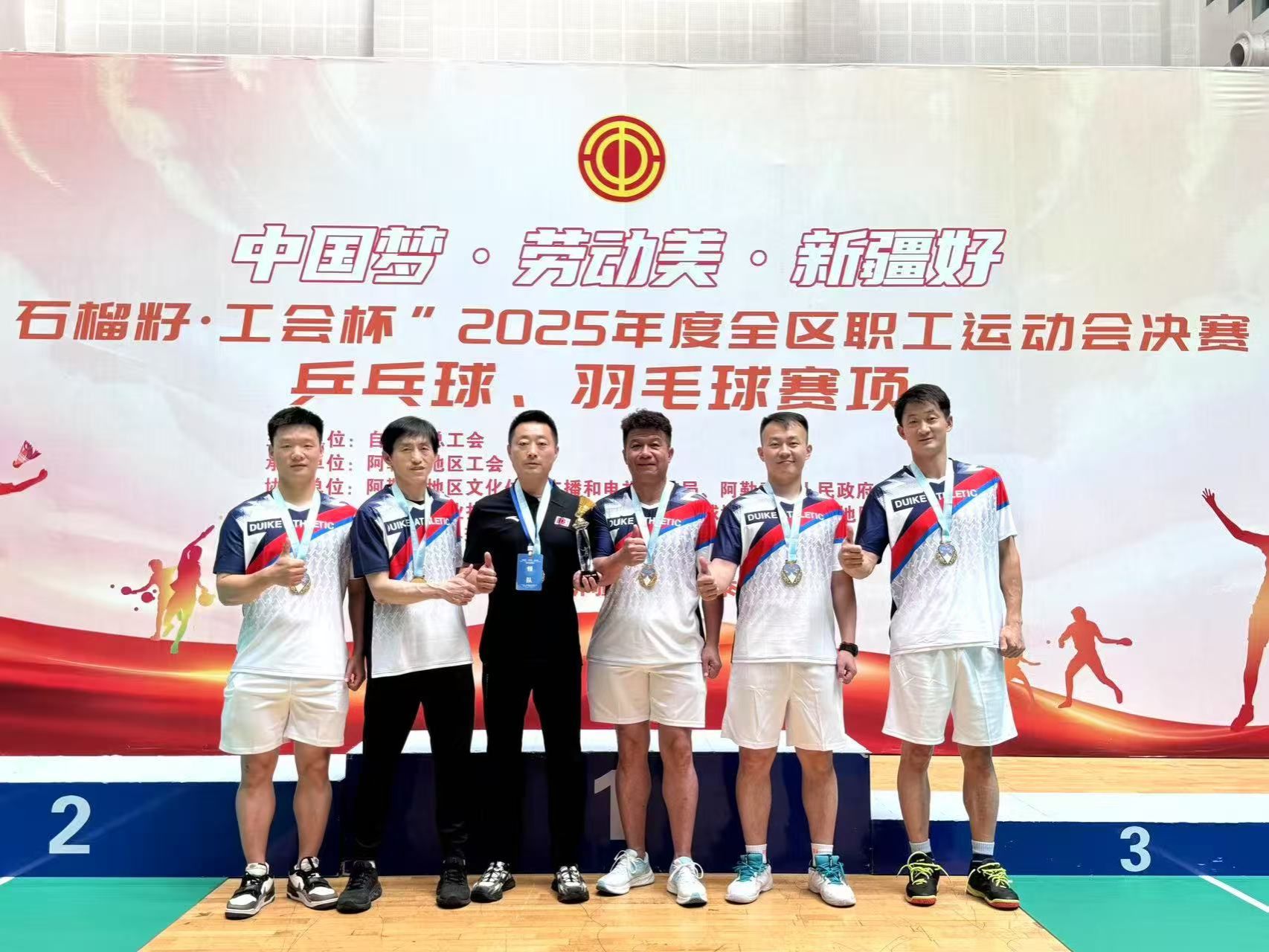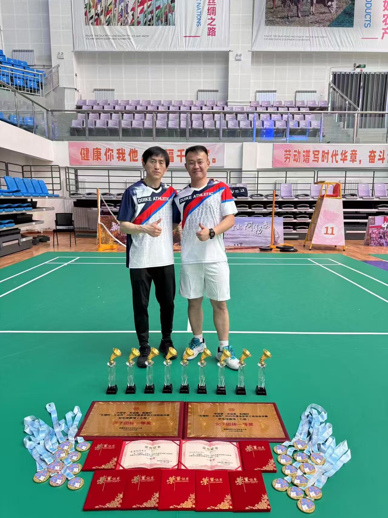 近日,由校工会推荐的我校体育学院教师马江骏、李哺淳,在代表自治区教育工会参加“石榴籽·工会杯”2025年度全区职工运动会羽毛球比赛中再创佳绩。马江骏、李哺淳斩获男子乙组团体冠军,李哺淳斩获乙组男双冠军,马江骏获得乙组混双第三名。