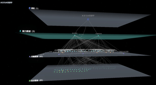 《水文与水资源学》AI课程知识图谱是由我校地理科学与旅游学院副院长叶茂教授带领其课程团队倾力打造,覆盖理论学习与实验实践两大部分,基于丰富的教学资源建立了知识、问题、能力及教学资源四维一体的知识图谱体系。其中,“知识图谱”梳理了85个知识点和224对知识关系,整合了基础理论、案例和最新研究成果;“问题图谱”围绕水资源管理和环境保护等议题设计了一系列探究性问题;“能力图谱”则利用AI工具培养学生的数据分析、解决问题和创新实践能力。