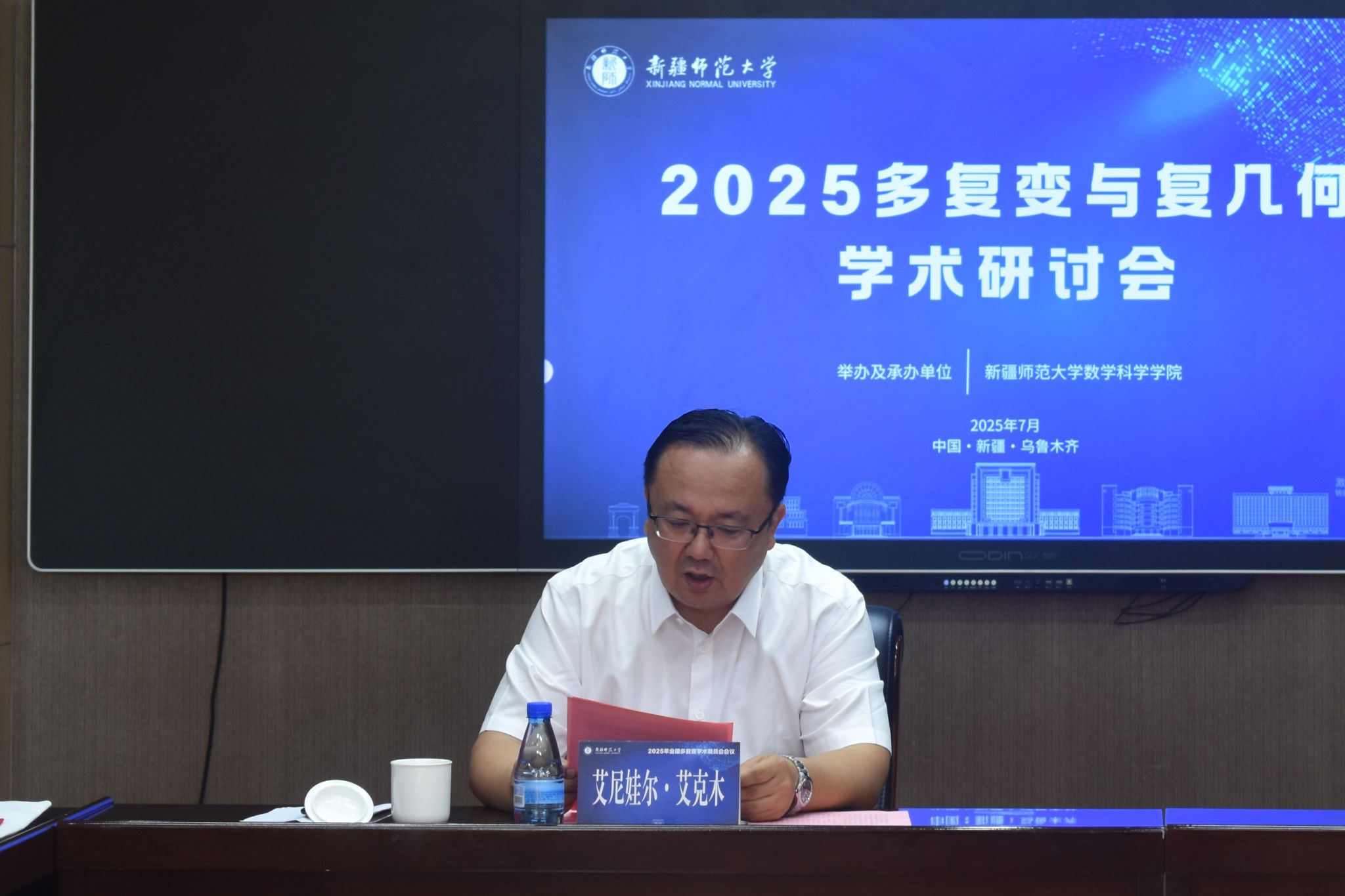 7月18日上午,由我校数学科学学院主办的2025多复变与复几何学术研讨会在我校温泉校区学术交流中心顺利开幕。来自全国各地、各高校的12名专家学者齐聚乌鲁木齐,聚焦多复变与复几何理论的研究,共同探讨多复变相关学科的前沿发展。中国科学院院士周向宇,校党委副书记、校长艾尼娃尔·艾克木出席开幕式并发表致辞,我校数学科学学院党委副书记、院长何勇主持开幕式。
