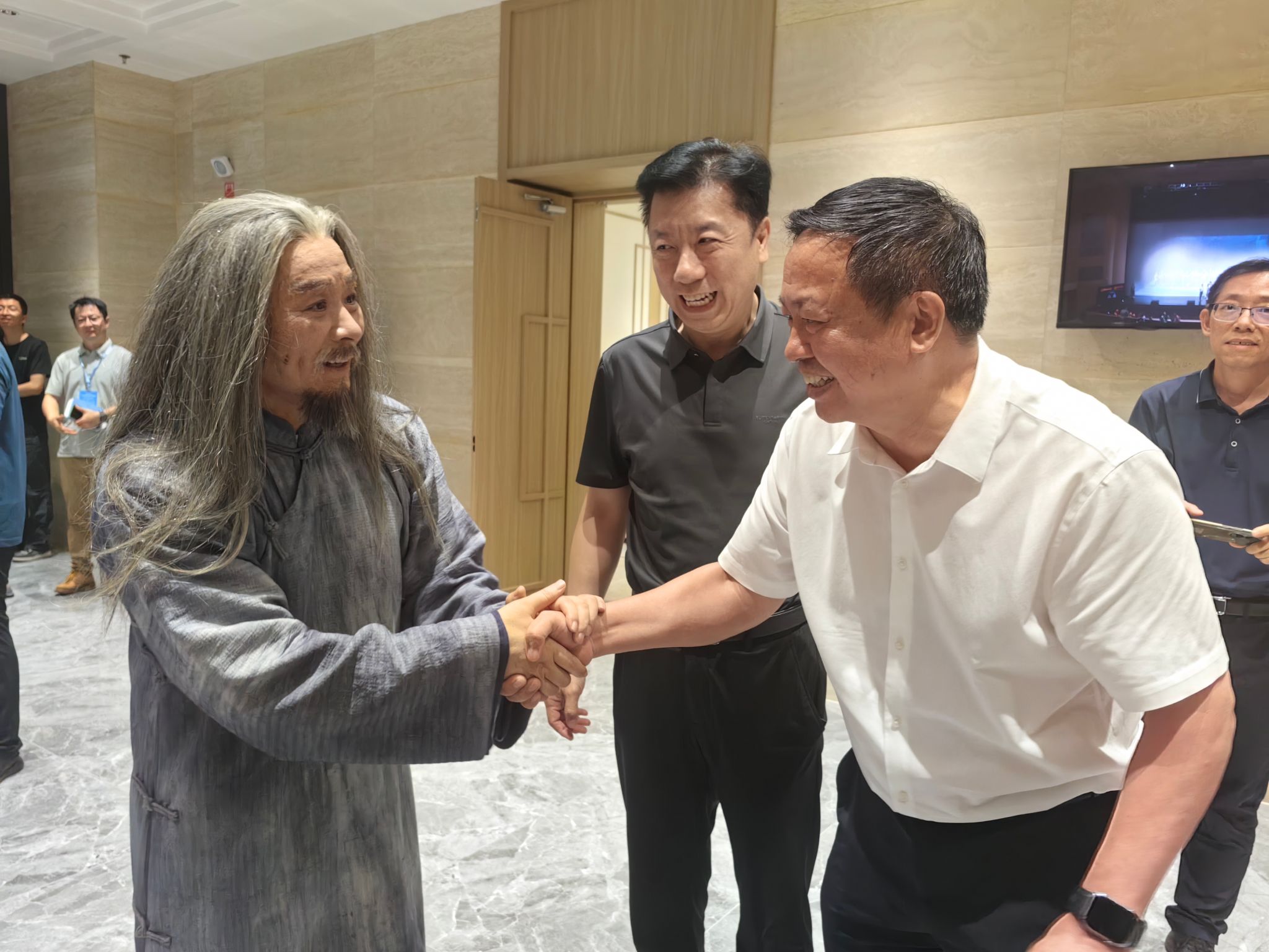 校党委书记蒋海军现场观看演出,并与王宏伟进行了深入交流。王宏伟对新疆师范大学团队给予的大力支持表示衷心感谢,他表示今后将持续深化全面加强合作,尤其是在人才培养与剧目建设领域携手发力,共创佳绩。蒋海军对天津音乐学院给予新疆师范大学师生的悉心指导与鼎力帮助致以谢意。他强调,此次民族歌剧《二泉》的合作,是两校全面签署战略合作协议以来的重大成果展现,天津音乐学院师生们的精彩演绎令人震撼,希望未来两校间保持密切的交流合作,同心协力培养更多新时代祖国需要的优秀艺术人才。
