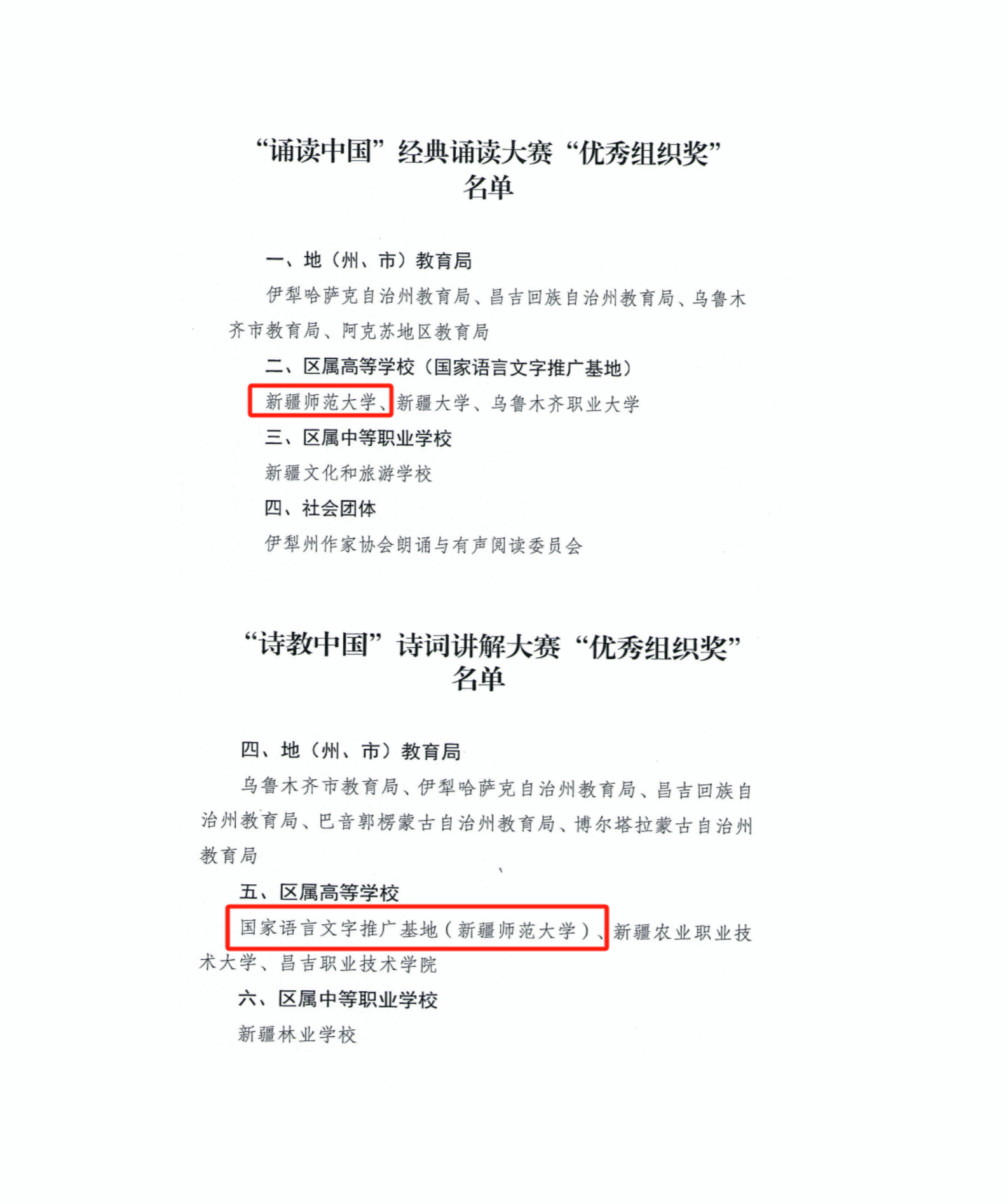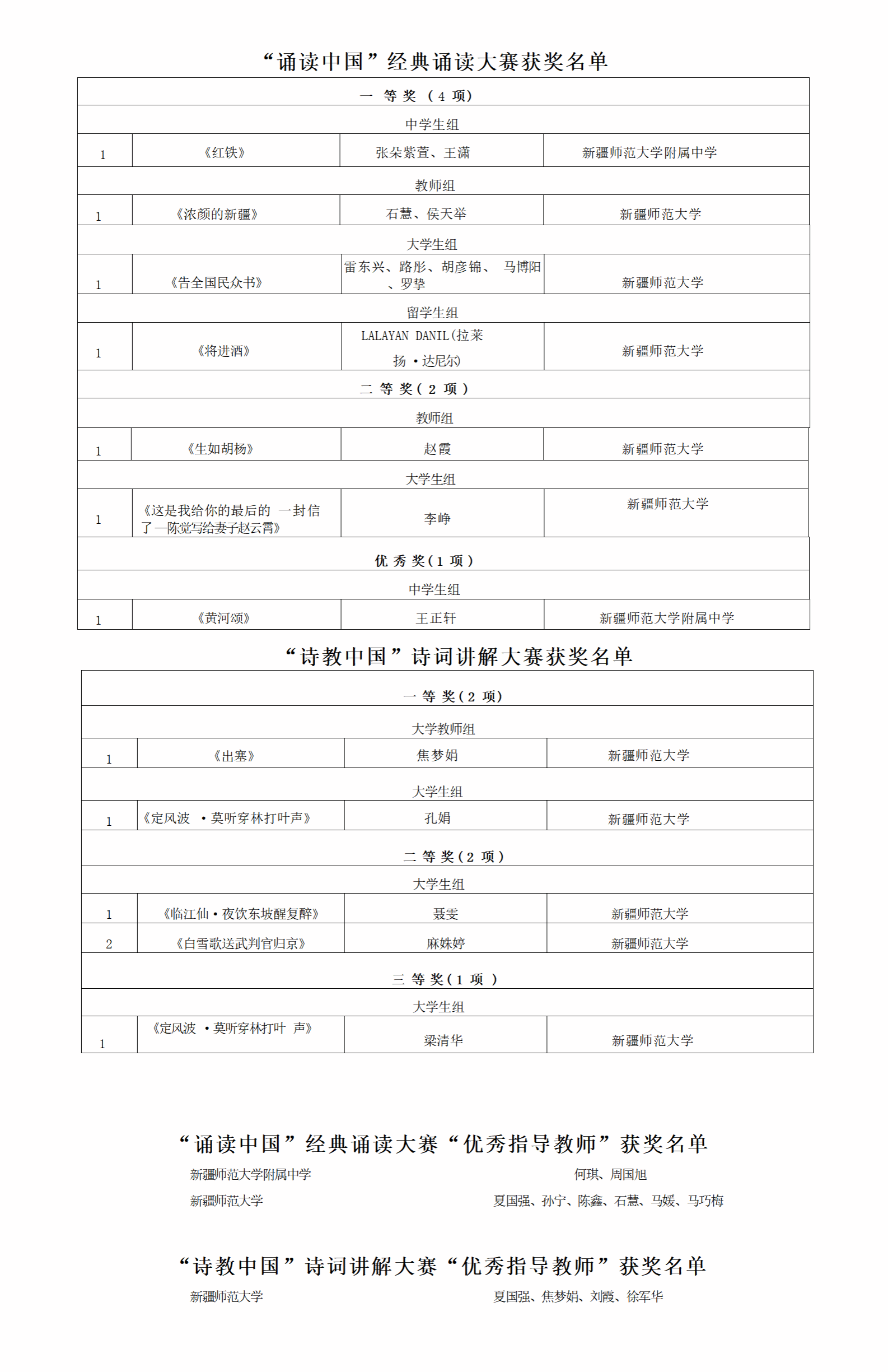 近日,第七届中华经典诵写讲大赛新疆赛区“诵读中国”经典诵读大赛及“诗教中国”诗词讲解大赛获奖名单经由主办方新疆维吾尔自治区教育厅完成评审并公示,我校经前期组织校级比赛和评选,报送作品120个,最终获一等奖6项、二等奖4项、三等奖1项,优秀奖1项,以上获奖作品将继续参与第七届中华经典诵写讲大赛全国复赛的激烈角逐。夏国强等获“优秀指导教师奖”,学校分获两类比赛“优秀组织奖”。