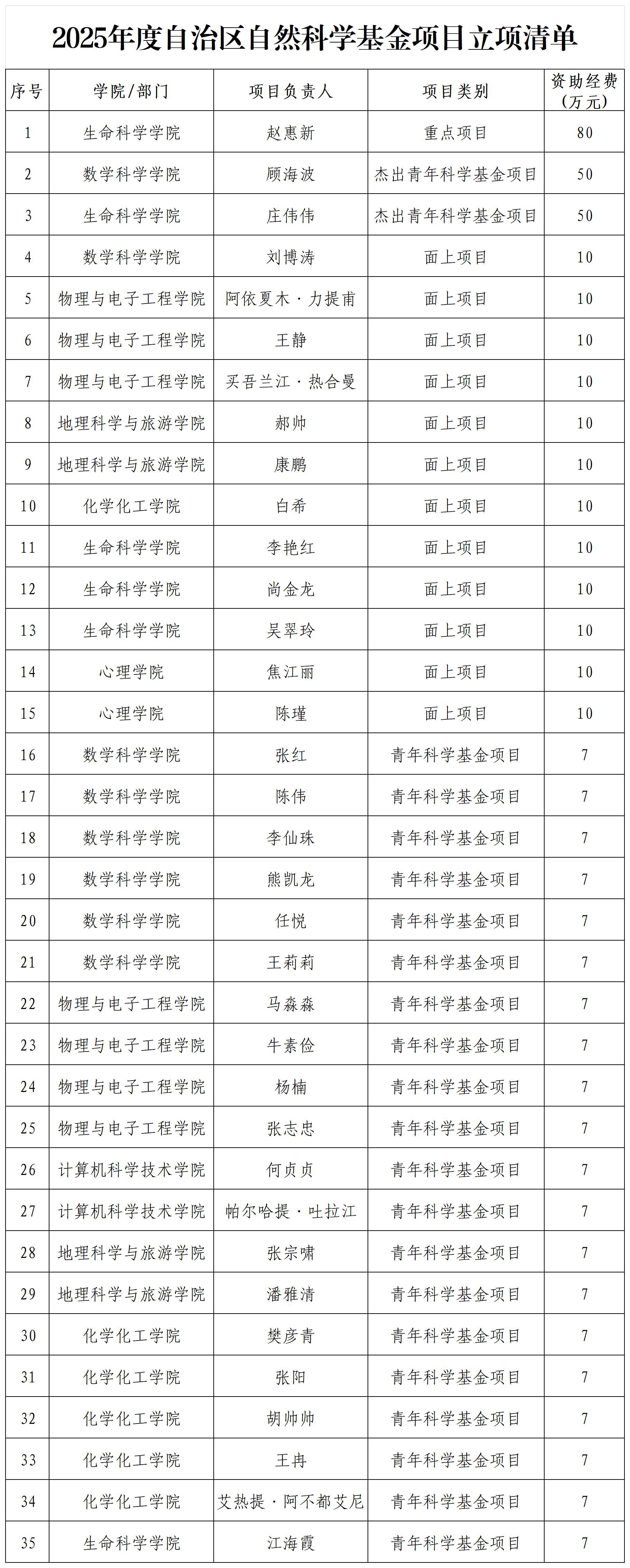 近日,自治区科技厅公布了2025年度自治区自然科学基金项目评审结果,我校共获批35项,其中重点项目1项、杰出青年科学基金项目2项、面上项目12项、青年科学基金项目20项。