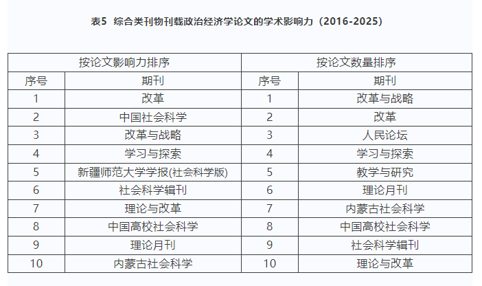 近日,《中国政治经济学学术影响力评价报告2025》正式发布。《新疆师范大学学报(哲学社会科学版)》进入中国政治经济学最具影响力的学术载体(2016-2025)榜单。《中国政治经济学学术影响力评价报告2025》对中国政治经济学学术载体进行了影响力评价,学术载体包括学术机构和学术刊物两类。本报告将学术刊物分为综合类刊物、经济类刊物和马克思主义理论类刊物三种类型,并根据刊物发表政治经济学论文的总影响力和刊物发表政治经济学论文的数量两个维度进行评价。《新疆师范大学学报(哲学社会科学版)》位列综合类刊物论文影响力排序第五名。
