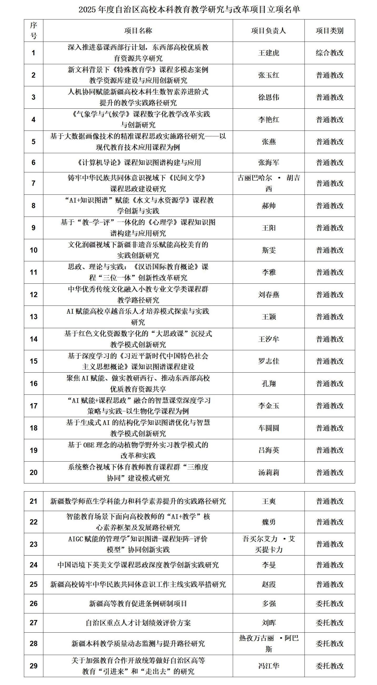 近日,自治区教育厅公布了《2025年度自治区高校本科教育教学研究和改革项目立项名单》。我校29个项目获批立项,其中综合教改项目1项、委托教改项目4项,普通教改项目24项,立项数量较往年大幅提高,充分彰显了学校深化教育教学改革、服务区域发展的显著成效。