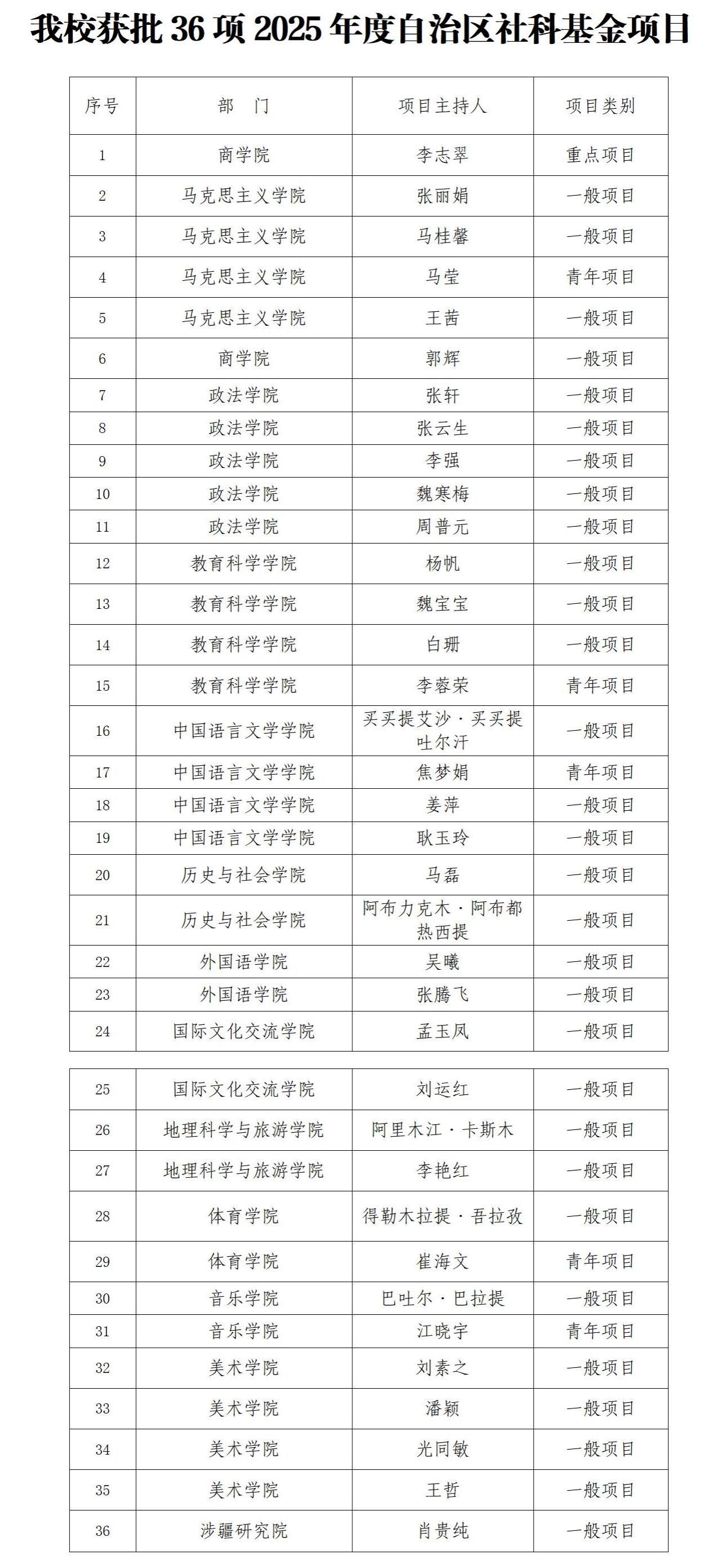 此次立项的36个项目涵盖了马列·科社、教育学、语言学、应用经济、中国文学、体育学、艺术学等多个学科领域,内容涉及新疆社会稳定与长治久安、教育高质量发展、文化传承与创新等重大课题。这些项目的研究开展,不仅将进一步提升我校的科研水平和学术影响力,还将为自治区的经济社会发展提供有力的智力支持和决策参考。