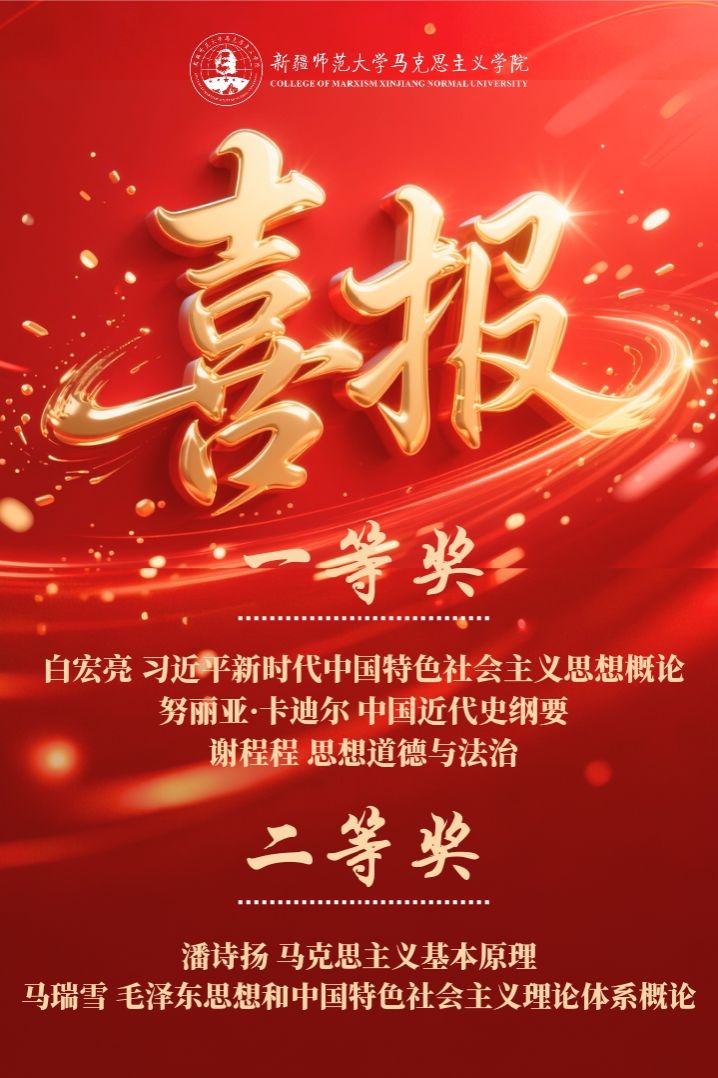 在自治区教学展示活动中,马克思主义学院白宏亮、努丽亚・卡迪尔、谢程程分别在“习近平新时代中国特色社会主义思想概论”“中国近现代史纲要”“思想道德与法治”课程竞赛中获一等奖;潘诗扬、马瑞雪在“马克思主义基本原理”“毛泽东思想和中国特色社会主义理论体系概论”课程竞赛中获二等奖。此外,努丽亚・卡迪尔、谢程程在自治区说课加赛中表现突出,被推荐参加第四届全国高校思政课教学展示活动,分别代表本科生课程“中国近现代史纲要”“思想道德与法治”参赛。