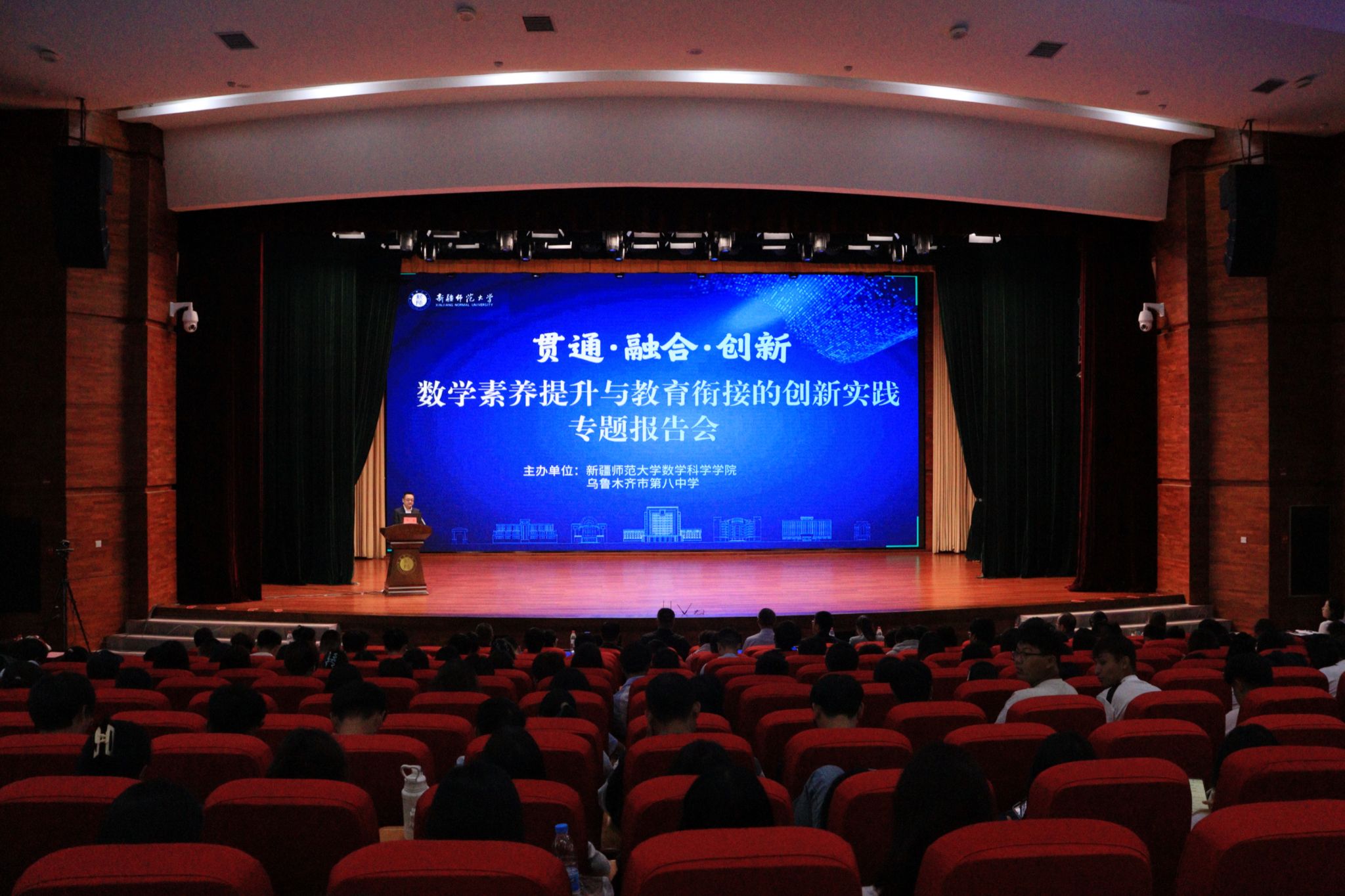 为落实《教育强国建设规划纲要(2024—2035年)》精神,着力破解学段壁垒,探索数学创新人才贯通培养的路径,9月2日上午,由我校数学科学学院与乌鲁木齐市第八中学联合主办的“贯通·融合·创新:数学素养提升与教育衔接的创新实践”专题报告会在温泉校区昆仑讲堂开幕。来自乌鲁木齐市头部中小学幼儿园领导、数学骨干教师代表、各地州数学国培区培学员、我校数学科学学院学科教学教师、数学与应用数学专业23级、24级本科生以及数学教育专业研究生参加会议。开幕式由我校数学科学学院党委副书记、院长何勇主持。