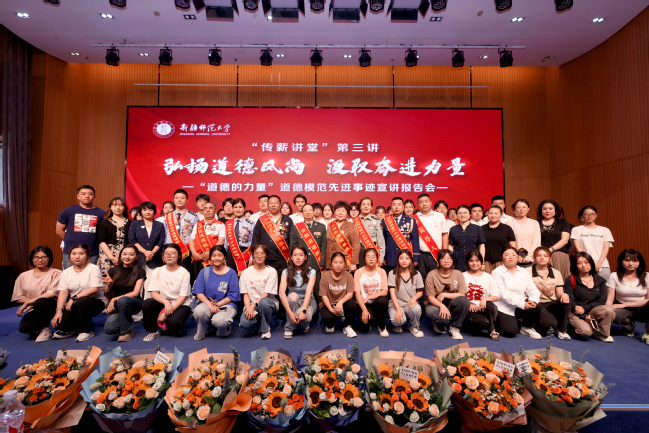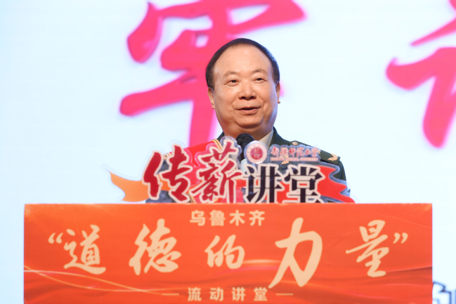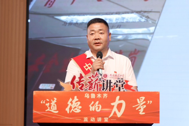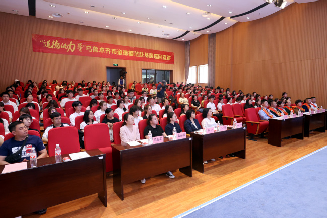 6月13日下午,由乌鲁木齐市委宣传部、水磨沟区委宣传部和新疆师范大学党委宣传部、校团委联合主办的“传薪讲堂”第三讲暨“道德的力量”道德模范先进事迹宣讲报告会,在我校温泉校区后勤楼报告厅举办。此次活动邀请乌鲁木齐市“好人好事宣讲团”的九位道德模范,通过先进事迹分享,传递社会正能量。校党委常委、副校长帕提曼·吐尔逊,乌鲁木齐市委宣传部公民道德建设科科长吕月婵,校党委宣传部、学生工作部(处)、校团委等相关部门教师出席活动,温泉校区各学院青年志愿者协会学生代表现场聆听。