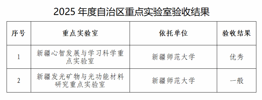 近日,自治区科技厅公布了2025年度自治区重点实验室验收结果。自治区科技厅对2021年认定的20家重点实验室进行了验收,我校两个自治区重点实验室顺利通过验收,其中“新疆心智发展与学习科学重点实验室”验收结果为“优秀”。