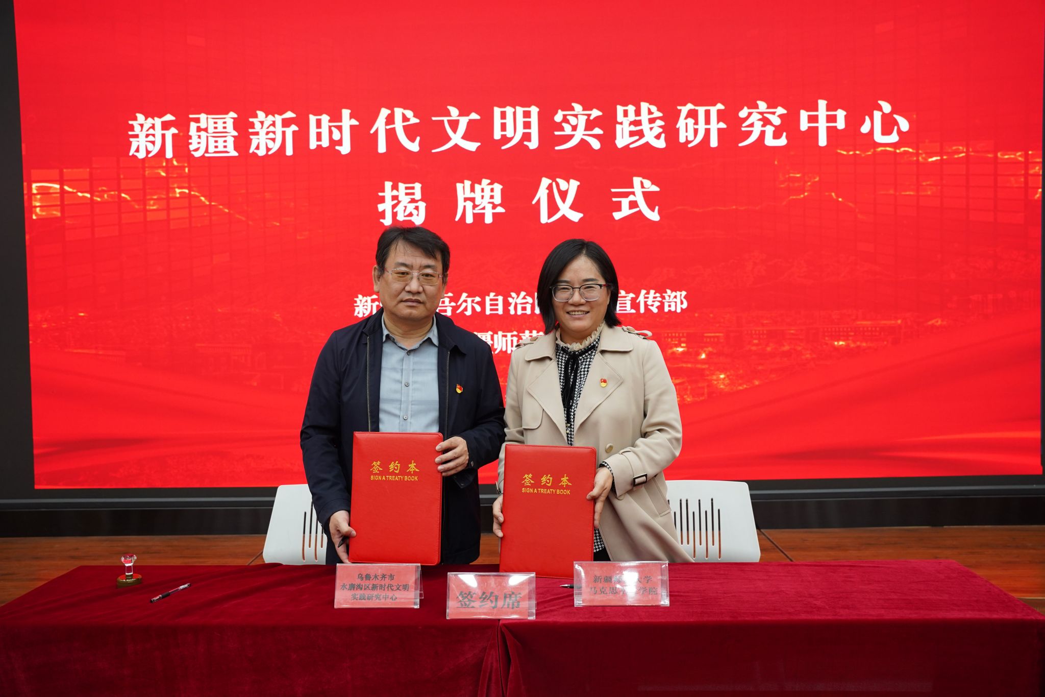 仪式上,我校马克思主义学院与乌鲁木齐市水磨沟区新时代文明实践研究中心现场签订共建协议,标志着研究中心在实践创新和成果转化方面迈出了重要一步。