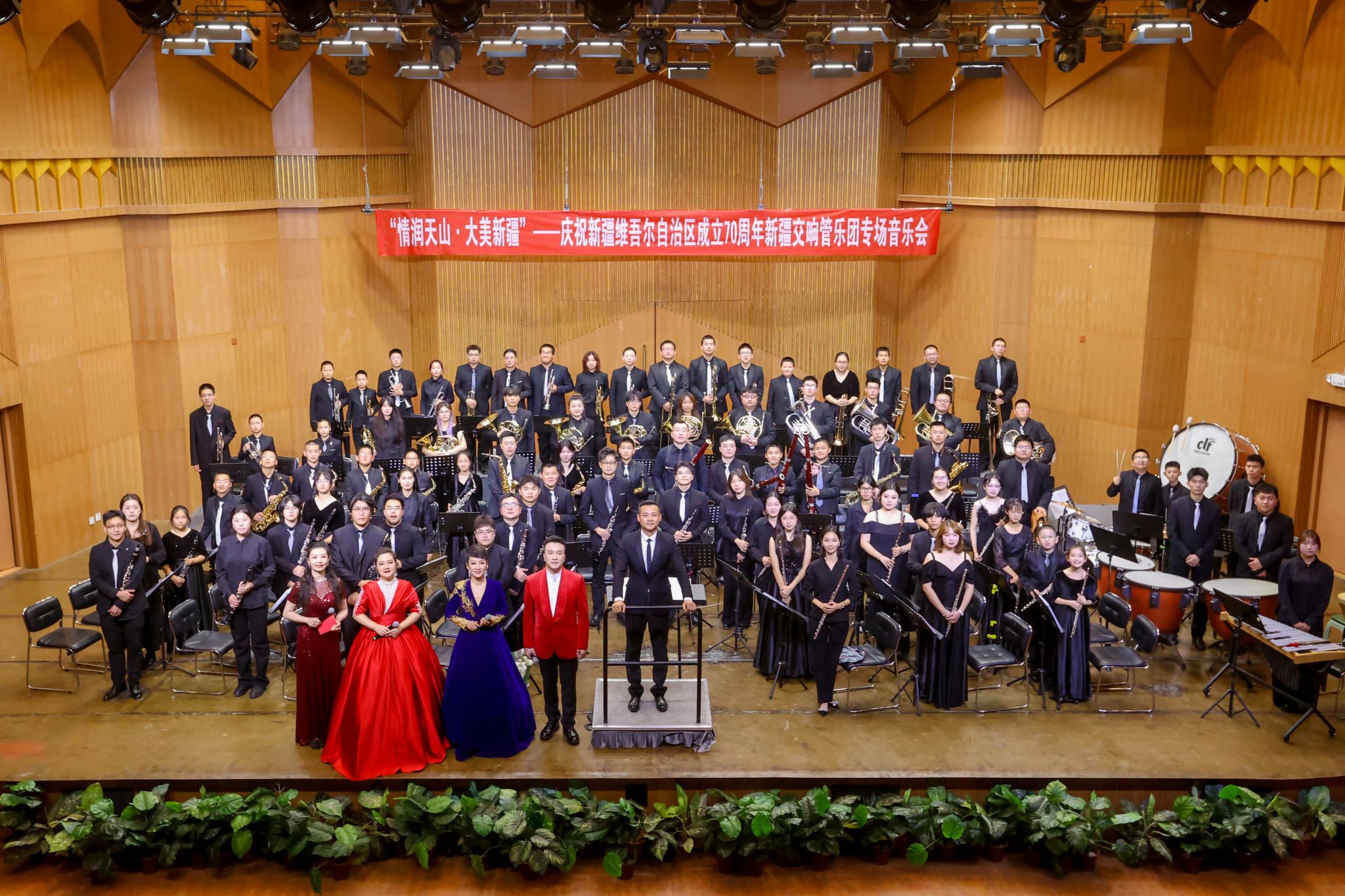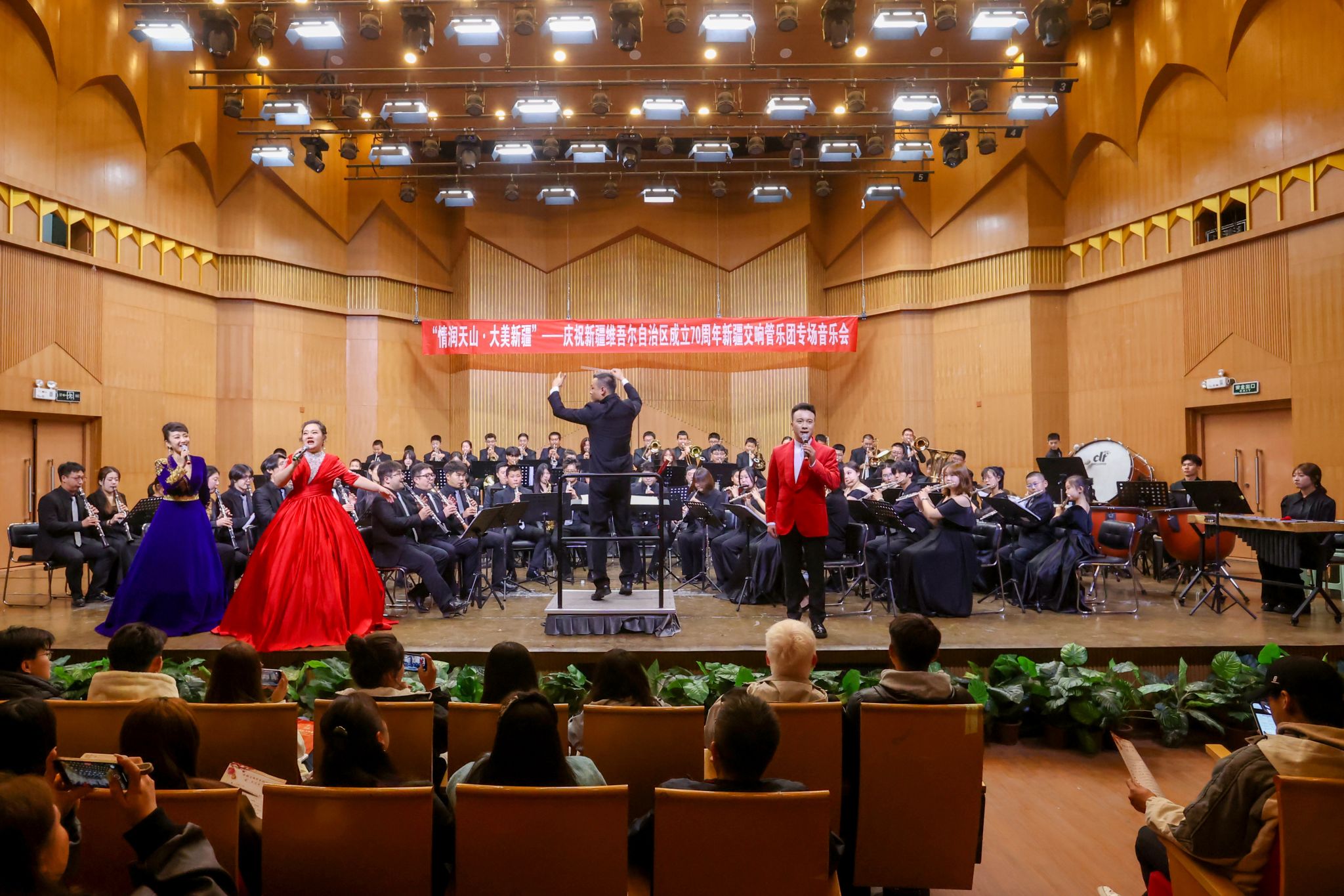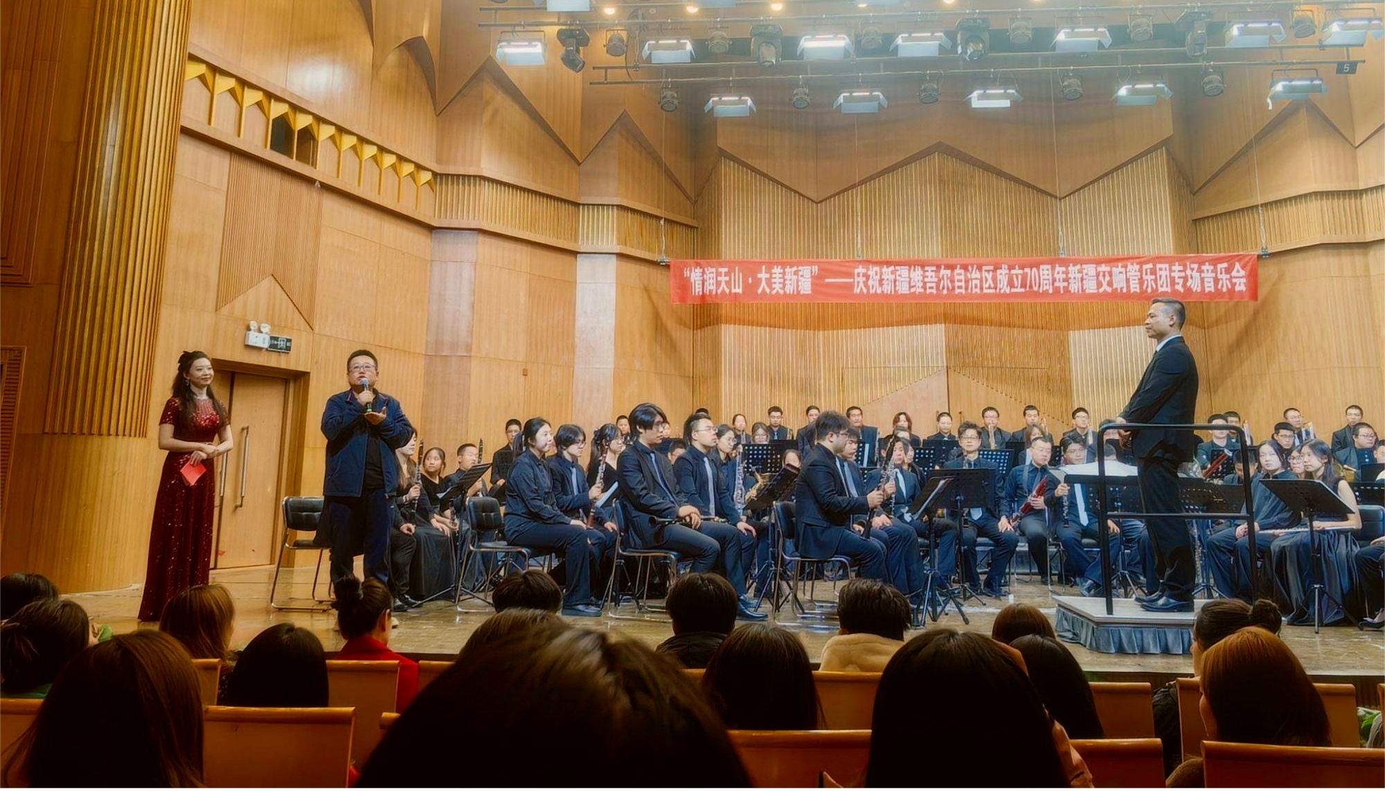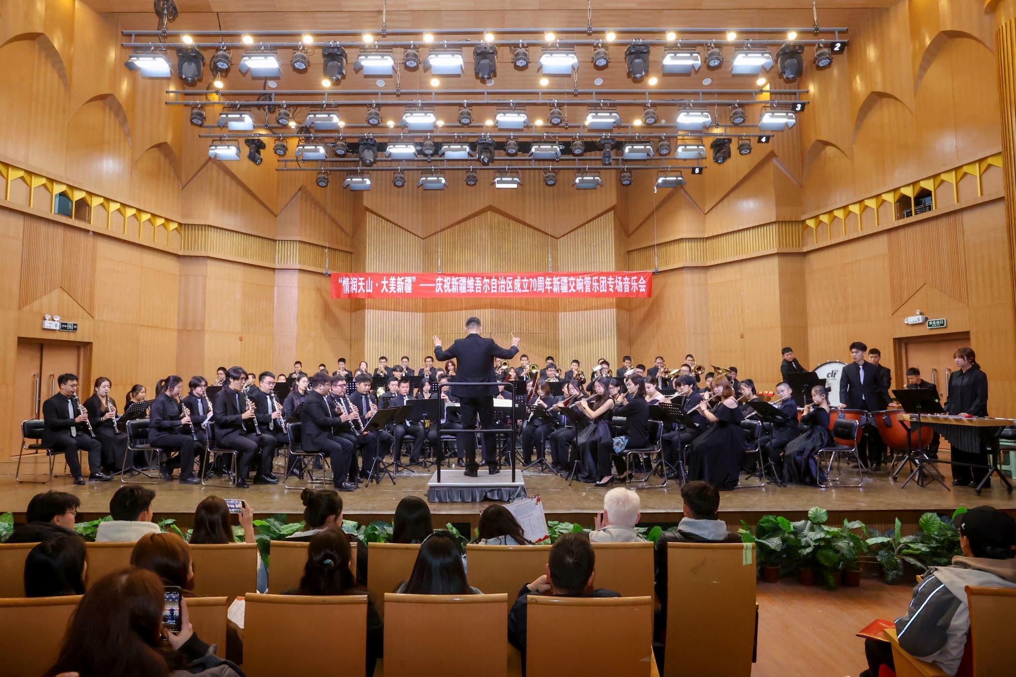 为深入学习贯彻习近平文化思想,坚决贯彻落实党中央关于新时代新疆工作的决策部署,积极响应“文化润疆”工作要求,为庆祝新疆维吾尔自治区成立70周年营造浓厚氛围,10月8日晚,“情润天山·大美新疆”——庆祝新疆维吾尔自治区成立70周年新疆交响管乐团专场音乐会在我校音乐厅成功上演。校党委书记蒋海军及500余名师生现场聆听音乐会。