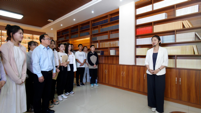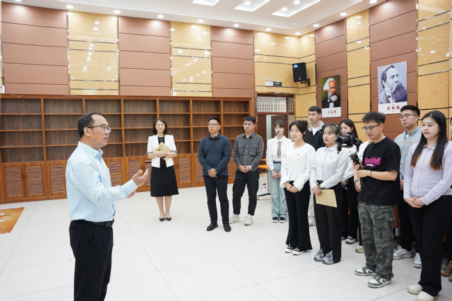行至《共产党宣言》珍本馆,在老师的讲述中,同学们再次体会到真理的力量,不同文字、语言版本的《共产党宣言》在这里集中呈现,静静地诉说着马克思主义的故事。同学们在展馆中以话剧形式重现了陈望道先生当年翻译《共产党宣言》的场景,让现场同学们再次体会到真理的味道真的甜!随后,老师向同学们展示了在展馆中的一份40年前我校老教师关于《共产党宣言》的手写授课讲稿。同学们纷纷表示,要不断从《共产党宣言》中汲取真理的力量,做马克思主义的传承者、传播者和践行者。