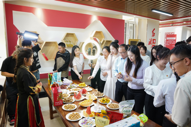 进入“治疆方略谱新篇”部分,几位维吾尔族姑娘在欢快的节奏中翩翩起舞,歌颂美好生活。党的十八大以来,习近平总书记一直关心新疆的建设发展,新疆各族人民在党中央的带领下对美好生活的信心更足。而在此时,不远处的卖货声吸引了同学们的目光,原来是一场关于新疆农产品的直播正在进行,“直播带货”的小哥邀请同学们现场品尝新疆特产:葡萄干、薄皮核桃、红枣……让同学们在这堂课中体会到新疆各族人民生活的巨大变化。