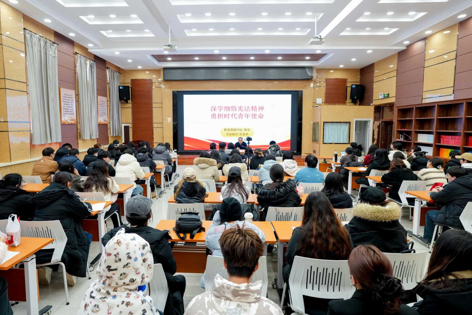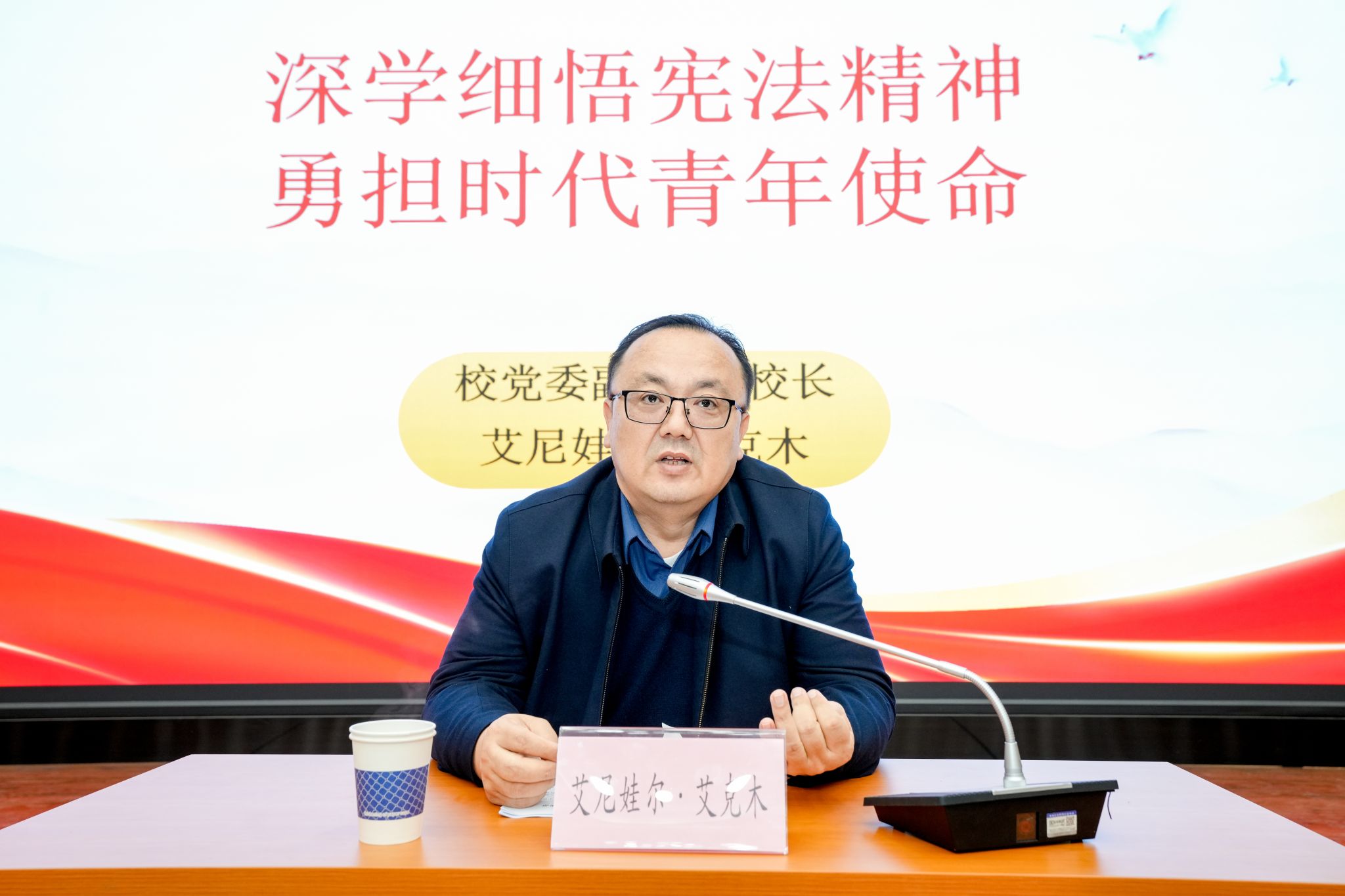 为全面落实立德树人根本任务,充分发挥领导干部在思想政治教育中的示范引领作用,11月7日,校党委副书记、校长艾尼娃尔・艾克木在文汇楼113报告厅,以“深学细悟宪法精神 勇担时代青年使命”为题,为我校马克思主义学院师生代表100余人讲授思政课。活动由我校马克思主义学院副院长罗志佳主持。