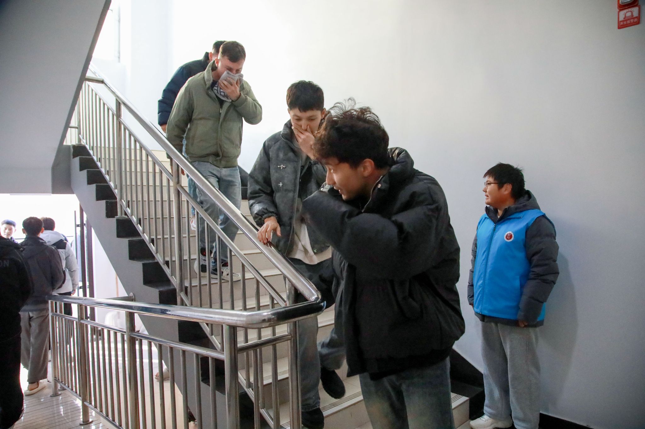 当天16时,随着急促的消防警报声响起,演练正式拉开帷幕。预设的“火情”发生在温泉校区9号学生公寓楼201室内,浓烟迅速蔓延。楼内值班人员第一时间发现“火情”并立即启动应急响应,拨打校园报警电话。各楼层疏导教师及学生志愿者迅速就位,按照预定疏散路线,引导同学们用湿毛巾捂住口鼻,弯腰低姿,快速有序地从各安全出口撤离至指定的应急避难集结区。整个疏散过程紧张而不慌乱,仅用时5分钟,所有参演师生便全部安全撤离至指定地点,达到了预期效果。