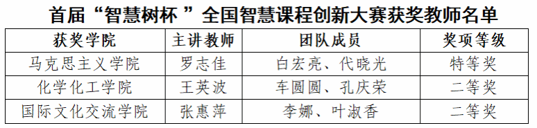 近日,首届“智慧树杯”全国智慧课程创新大赛(课创赛)获奖名单正式公示,我校教师团队在全国赛事中表现优异,罗志佳教师团队荣获特等奖,王英波教师团队、张惠萍教师团队荣获二等奖,新疆师范大学荣获“优秀组织奖”称号。