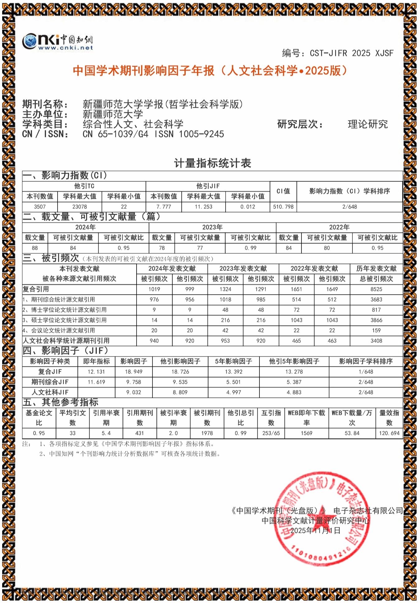 近日,据中国知网《中国学术期刊影响因子年报(人文社会科学·2025版)》数据显示,《新疆师范大学学报(哲学社会科学版)》影响力指数、复合影响因子、复合即年指标均位列全国高校综合性人文、社会科学学报第一名。其中,复合影响因子达到18.949,再创历史新高,首次位列全国综合性人文、社会科学期刊第一名,连续五年位列全国高校综合性人文、社会科学学报第一名。