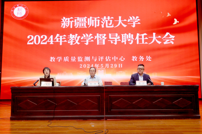 会上,刘俊宣读了学校2024年教学督导聘任文件,参会校领导为23位新聘任的专兼职教学督导颁发了聘书并合影。教育科学学院教师热孜万·阿巴斯代表新聘任的教学督导进行表态发言。她表示教学督导工作责任重大、使命光荣,今后要将“求知、力行、提效”作为督导工作的重要支点,努力做一名称职的教学督导。陈彤对受聘的新任教学督导心系学校、强师爱生、赤诚奉献的精神表示感谢。同时要求教学督导们深入课堂、了解教学;注重实效、提升质量;积极创新、推动改革;树立榜样、贡献力量。希望全体教师在学校发展建设的关键之年,统一思想、凝聚共识,为学校教育教学改革发展做出更大的贡献。