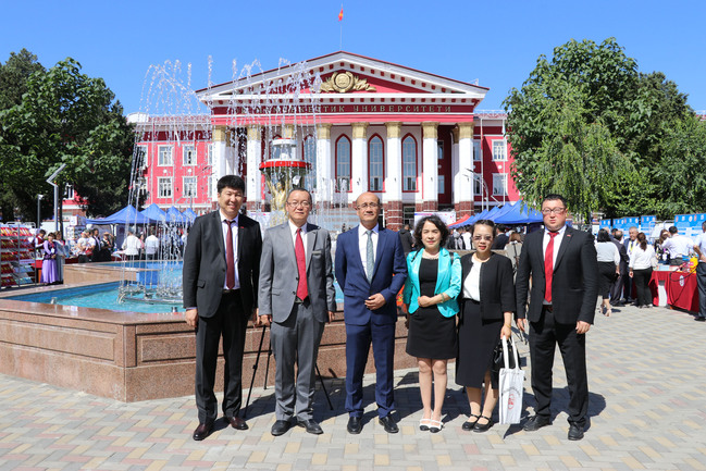 5月31日,代表团参加奥什国立大学85周年校庆活动。吾满江·艾力先后与中华人民共和国驻吉尔吉斯共和国大使杜德文、奥什国立大学校长科卓别科夫会见交流。