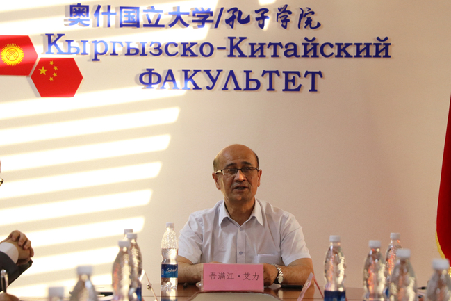 在奥什国立大学校庆论坛上,吾满江·艾力代表新疆师范大学向奥什国立大学表示了诚挚的祝贺,并表示新疆师范大学与奥什国立大学共同建设的孔子学院,已经成为中吉两国文化交流的重要桥梁,新疆师范大学将继续深化与奥什国立大学的合作关系,进一步加强师生交流,特别是两国青年学生的交流往来。在校庆论坛上,吾满江·艾力还向参会代表介绍了新疆师范大学在产学研方面所取得的成果。