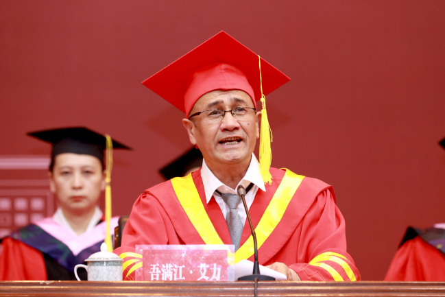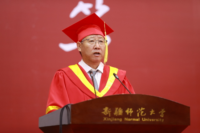 在现场热烈的掌声中,校党委书记葛国代表学校向全体2024届毕业生寄语,向圆满完成学业的毕业生们表达了殷殷嘱托与真诚祝愿,对全体老师们的辛勤栽培和广大家长的大力支持表示衷心感谢。葛国表示,2024届全体毕业生,在校求学四年期间,共同见证了中国共产党成立100周年、党的二十大胜利召开这样的历史时刻,亲历了脱贫攻坚千年梦圆、全面建成小康社会的伟大奇迹,站在中国式现代化新征程起航之际,“两个一百年”奋斗目标的历史交汇期,参与了新时代党的治疆方略指引下,建设大美新疆的生动实践,不负时代所托,勇敢迎接挑战,在圆满完成学业的同时,用实际行动践行了新时代中国青年“请党放心,强国有我”的青春誓言。