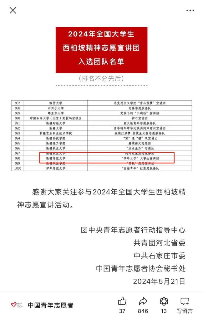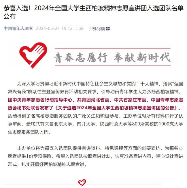 为深入学习贯彻习近平新时代中国特色社会主义思想和党的二十大精神,落实“强国复兴有我”群众性主题宣传教育活动相关要求,引导动员青年学生大力弘扬西柏坡精神,团中央青年志愿者行动指导中心、共青团河北省委、中共石家庄市委、中国青年志愿者协会秘书处联合发布了《关于遴选2024年全国大学生西柏坡精神志愿宣讲团的公告》。活动得到了各高校志愿服务团队的广泛关注和积极参与。主办单位对所有材料进行了认真审阅,最终共有来自北京大学、南开大学、陕西师范大学等809所高校的1000支大学生志愿服务团队入选。其中,我校商学院“学岭云杉”大学生宣讲团成功入选2024年全国大学生西柏坡精神志愿宣讲团。