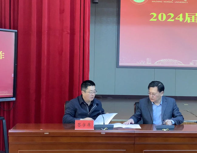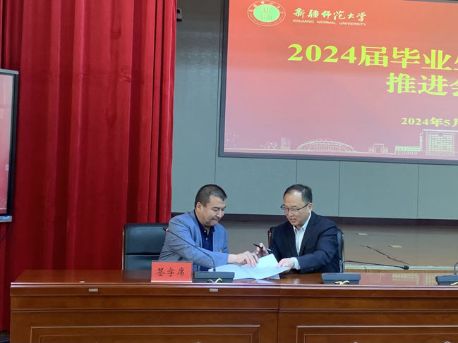 校党委副书记、校长吾满江·艾力出席会议并讲话,会议由校党委副书记刘俊主持。会上,校党委常委、宣传部部长高靖宣读了《新疆师范大学关于做好2024届毕业生就业创业工作的通知》,历史与社会学院党委书记白丽艳、化学化工学院党委副书记、纪委书记王强华就做好2024届毕业生就业工作作了会议发言。刘俊、高靖分别同美术学院党委书记比拉力江·阿不力孜、中国语言文学学院党委书记陈国栋签订了就业工作目标责任书。