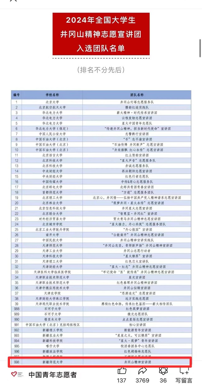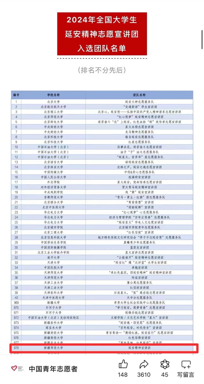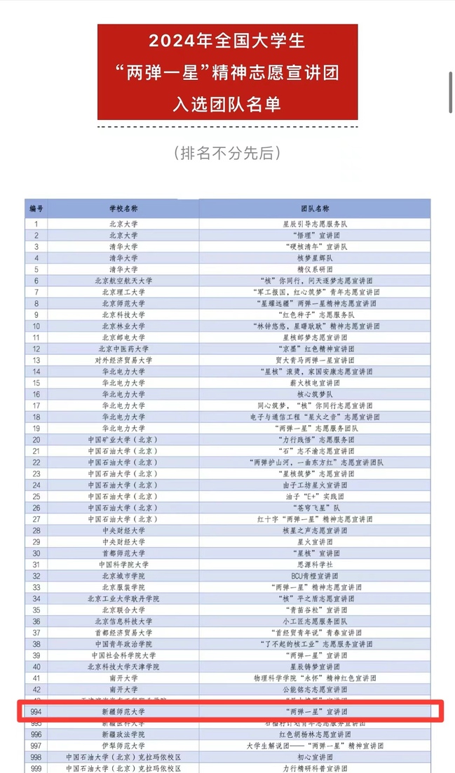 近日,大学生志愿宣讲团队入选名单公布,我校3支队伍从全国八百多所高校的千余支队伍中脱颖而出,成功入选2024年全国大学生延安精神志愿宣讲团、井冈山精神志愿宣讲团和“两弹一星”精神志愿宣讲团。