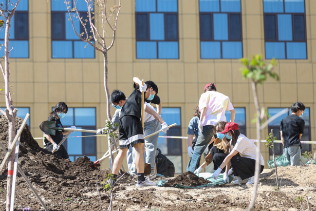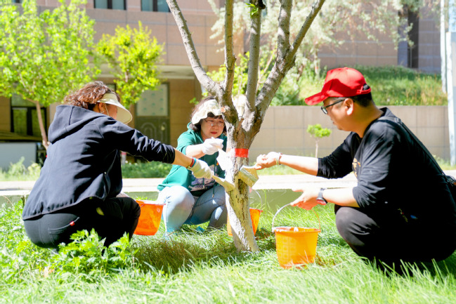 启动仪式后,在校领导的带领下,现场师生分为五个小组开展植树绿化活动。大家默契协作,以饱满的热情积极投入到校园植树绿化美化中,涂白绿地树木、补种红叶海棠、翻耕平整绿地、清除绿地内杂草,为绿化地施肥、翻耕、平整、清除碎石垃圾等,现场一片火热繁忙景象。